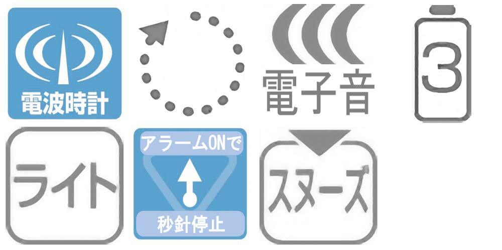 アラーム:電子音(ピ・ピ・ピ)(00秒に鳴るジャストアラーム機能)(止めても又鳴るスヌーズ機能)