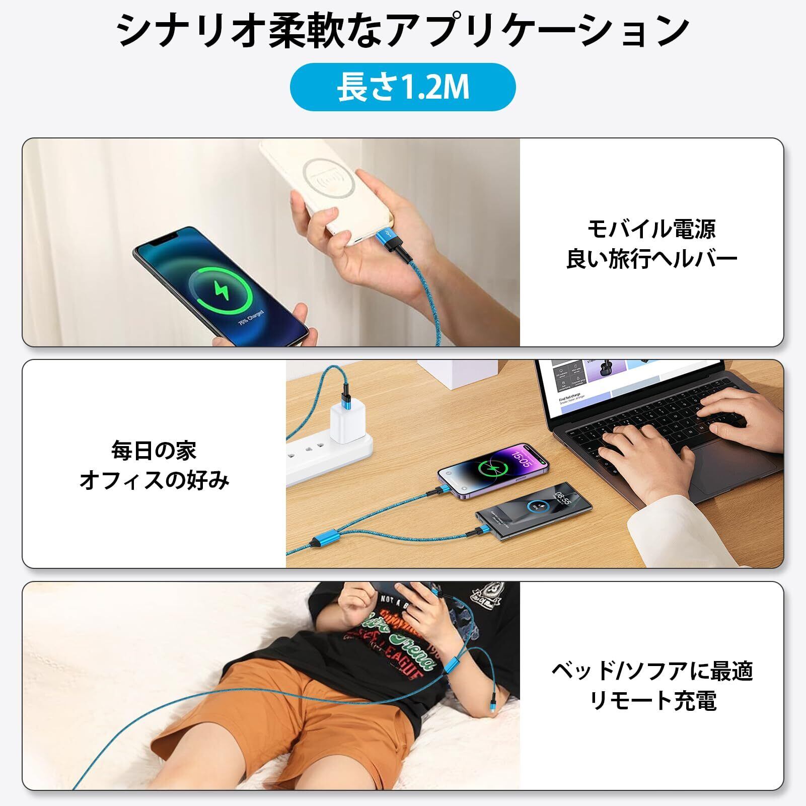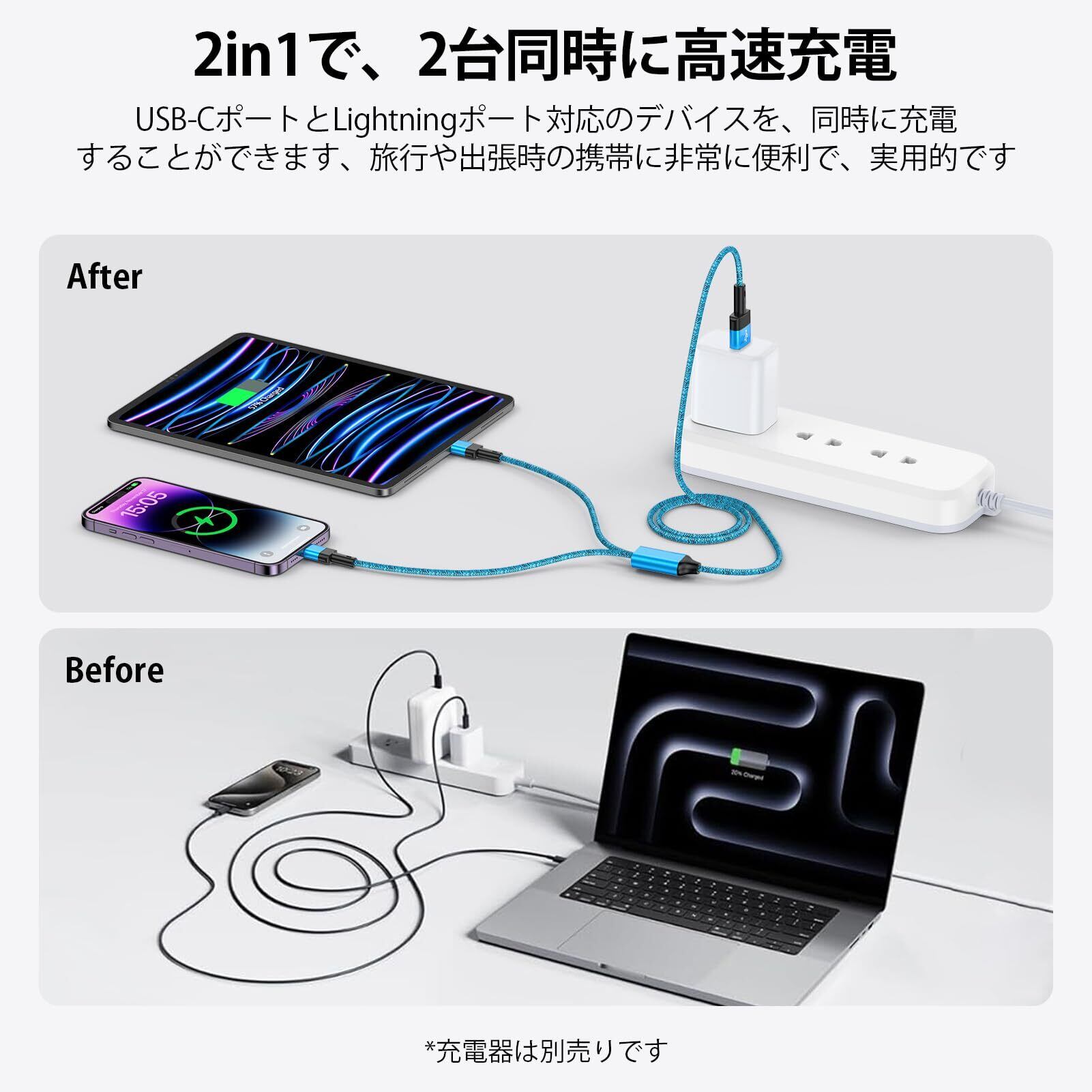 【1本2役】Zacenei 2in1 充電ケーブルは、iPhoneのLightningポートとType-Cポートの両方に対応しており、1本で2つの異なるデバイスに充電が可能です。ケーブルの長さは120cmで、分岐部分は20cm。2台のデバイスを同時に充電でき、自宅、オフィス、車内など、さまざまなシーンで1本あれば十分です。