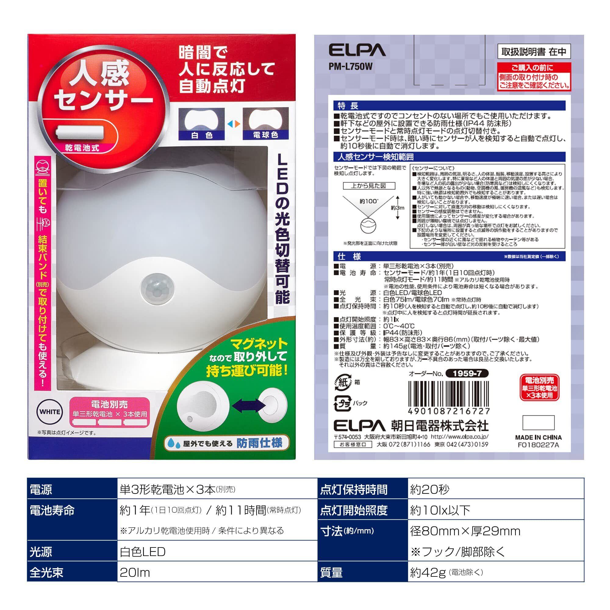 エルパ (ELPA) LEDセンサー付ライト (白色・電球色/電池式/防雨) 人感センサー/球型/マグネット/ネジ止め可能 (PM-L750W)