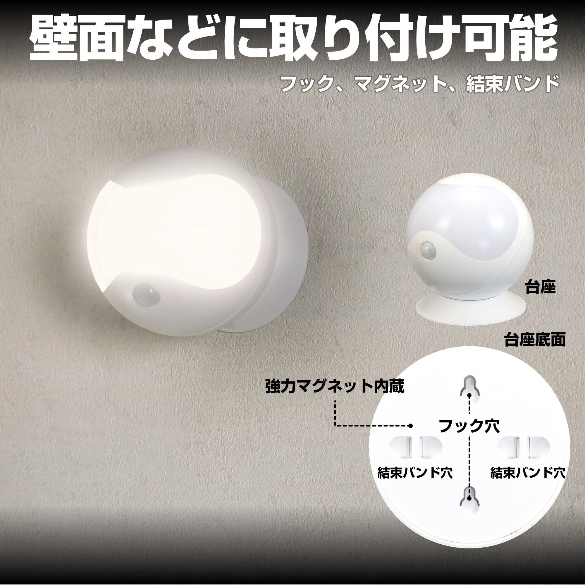 ■電源:単三形電池×3本(別売) ■電池寿命:センサーモード / 約1年(1日10回点灯時) 常時点灯モード / 約11時間 ※アルカリ乾電池使用時 ※電池の性能、使用条件により電池寿命は短くなる場合があります。 ■光源:白色LED/電球色LED ■全光束:白色 75lm / 電球色 70lm ※常時点灯時 ■点灯保持時間:約10秒(人を検知すると自動で点灯し、約10秒後に自動で消灯します) ※点灯中に人を検知すると点灯時間が延長されます。 ■点灯開始照度:約1lx ■使用温度範囲:0℃~40℃ ■保護等級:IP44(防沫形) ■外形寸法(約):幅83×高さ83×奥行86(mm)(取付パーツ除く・最大値) ■質量:約145g(電池・取付パーツ除く)