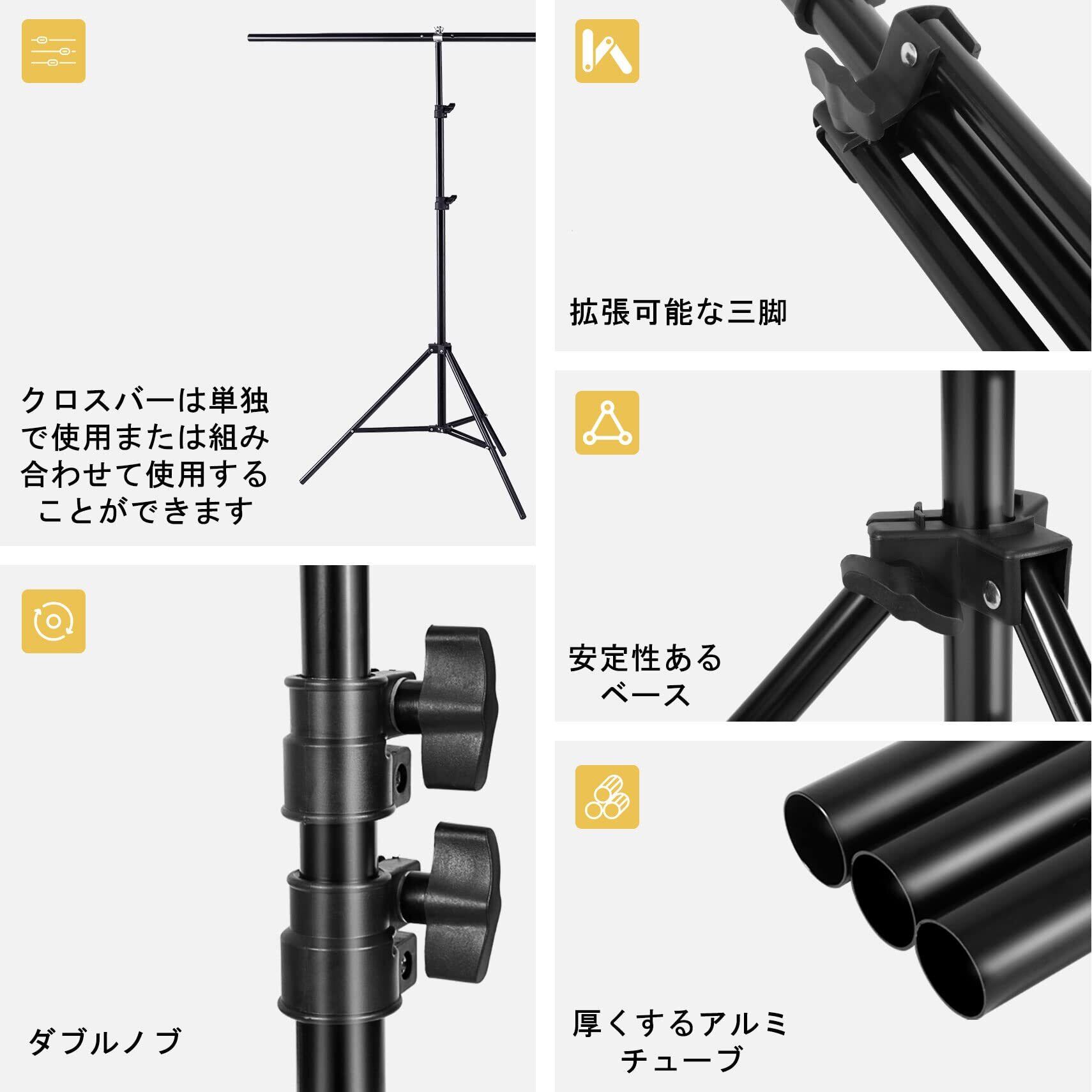 2つのクロスバーありますので、スタンドの横棒は150cmまで伸ばします、高さは70cmから200cmまで調節可能です。各サイズの背景紙も対応できます。背景に対してよく作れた製品、人物撮影、小物や子供を撮影するのは理想的です。