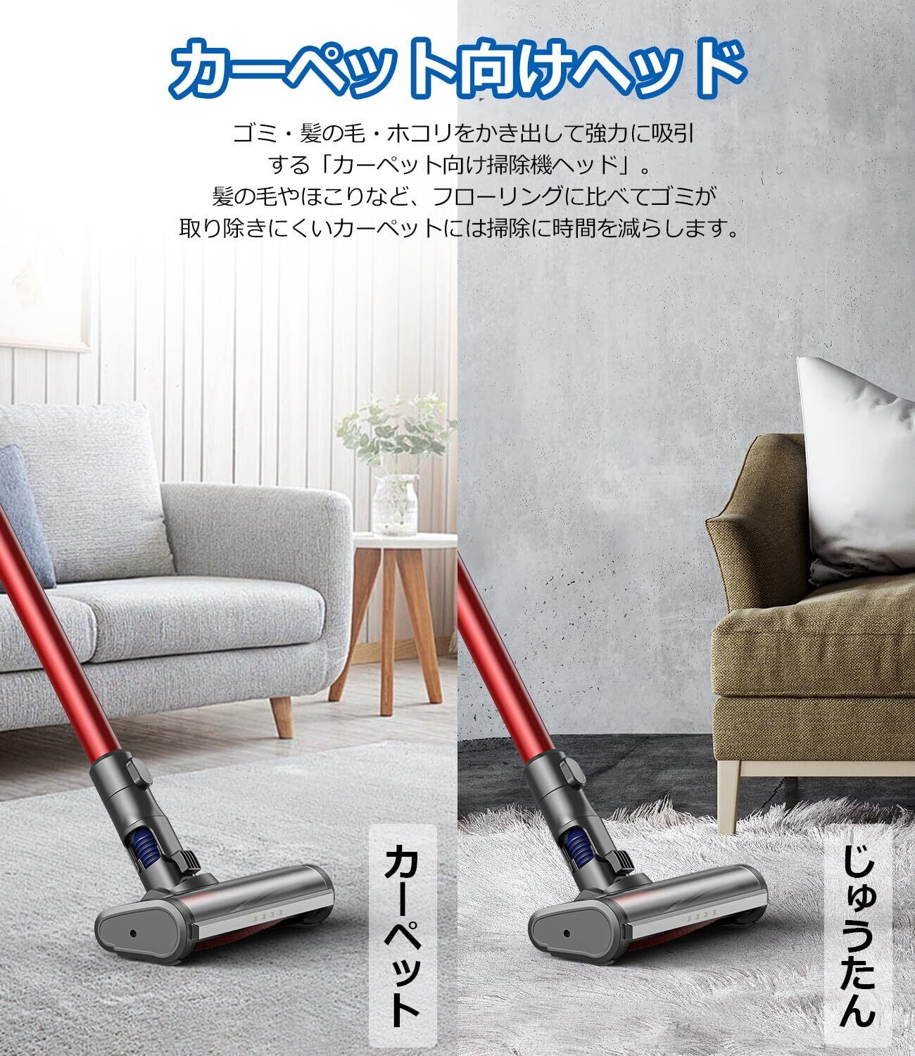 【カーペット向け掃除機 ヘッド】:掃除機ヘッドは、ナイロン製のブラシとカーボンファイバーブラシの組み合わせ。ナイロン製のブラシがカーペットの繊維の奥深くまで入り込み、ホコリや毛をかき出します。また、柔らかいカーボンファイバーブラシが静電気を抑え、繊維にくっついた細かいホコリまで掃除します。