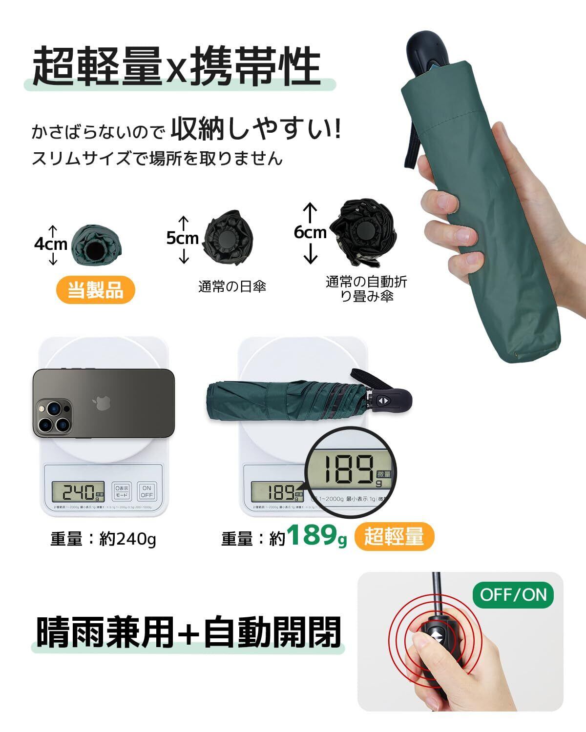 【超軽量*携帯便利*省力60%】改良版は60%省力:私たちは力の弱いお客様向けに、傘の収納の重さを改良しました。折りたたみ日傘フラットなデザインで、バッグに簡単に入れることができます。折りたたんだ厚さはわずか4cm、長さは25.5cm、重さは約189gです。超コンパクトボディ 使用?携帯に便利!全天候対応でき、雨の日も雪の日も晴天も使えます。男女兼用ワンタッチ 自動開閉折り畳み傘。通学、通勤、遠足、旅行,出張などの場合がご利用できます。