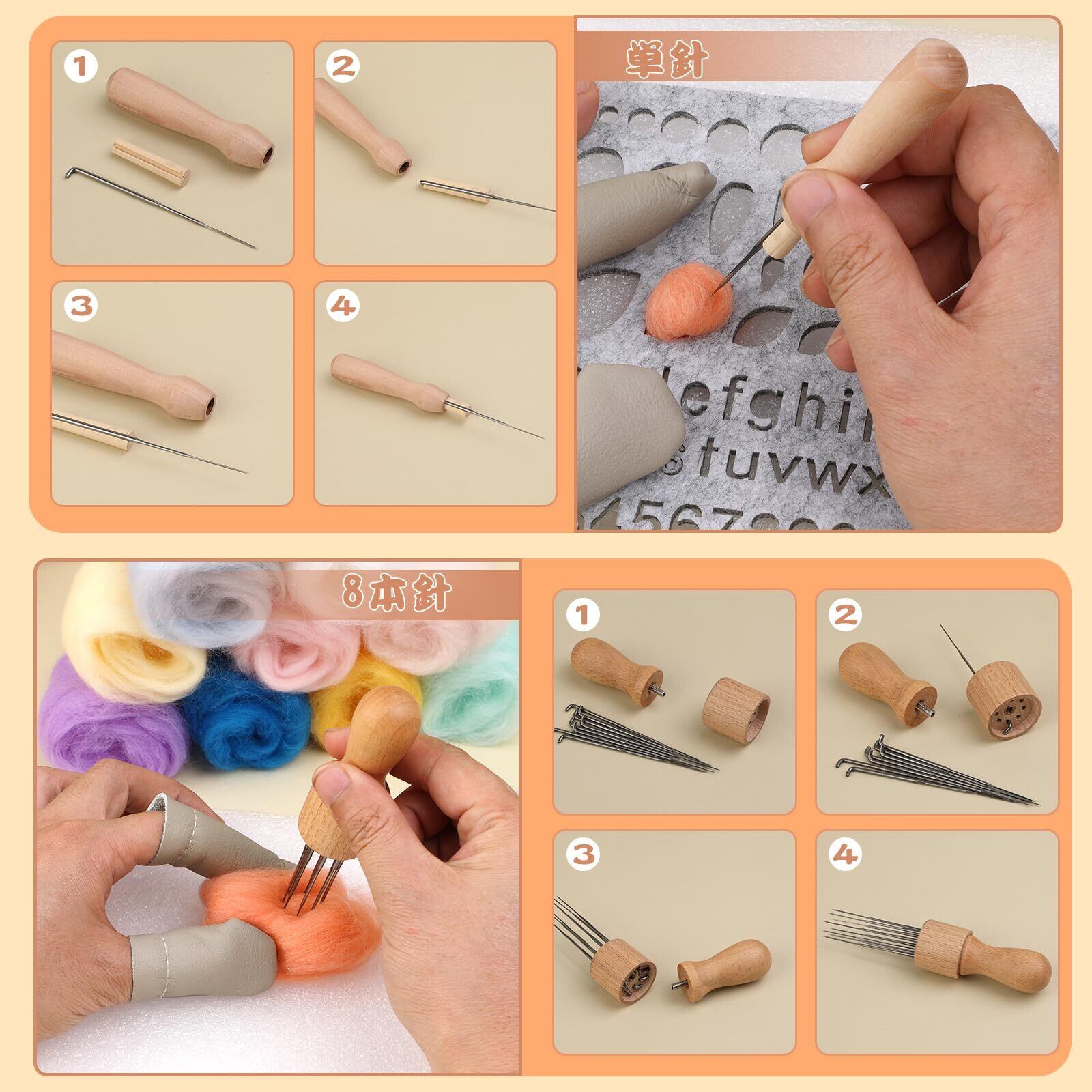 ニードルフェルト針 8本: 複数のニードルを一度に使用できるタイプの場合、一度にたくさん刺すことができるので、単純に作業スピードが上がります。特に広い面積をフェルト化したい場合、1本のニードルだけで作業するのとは完成までにかかる時間は全く異なります。木製なので持ちやすくて手に優しい。