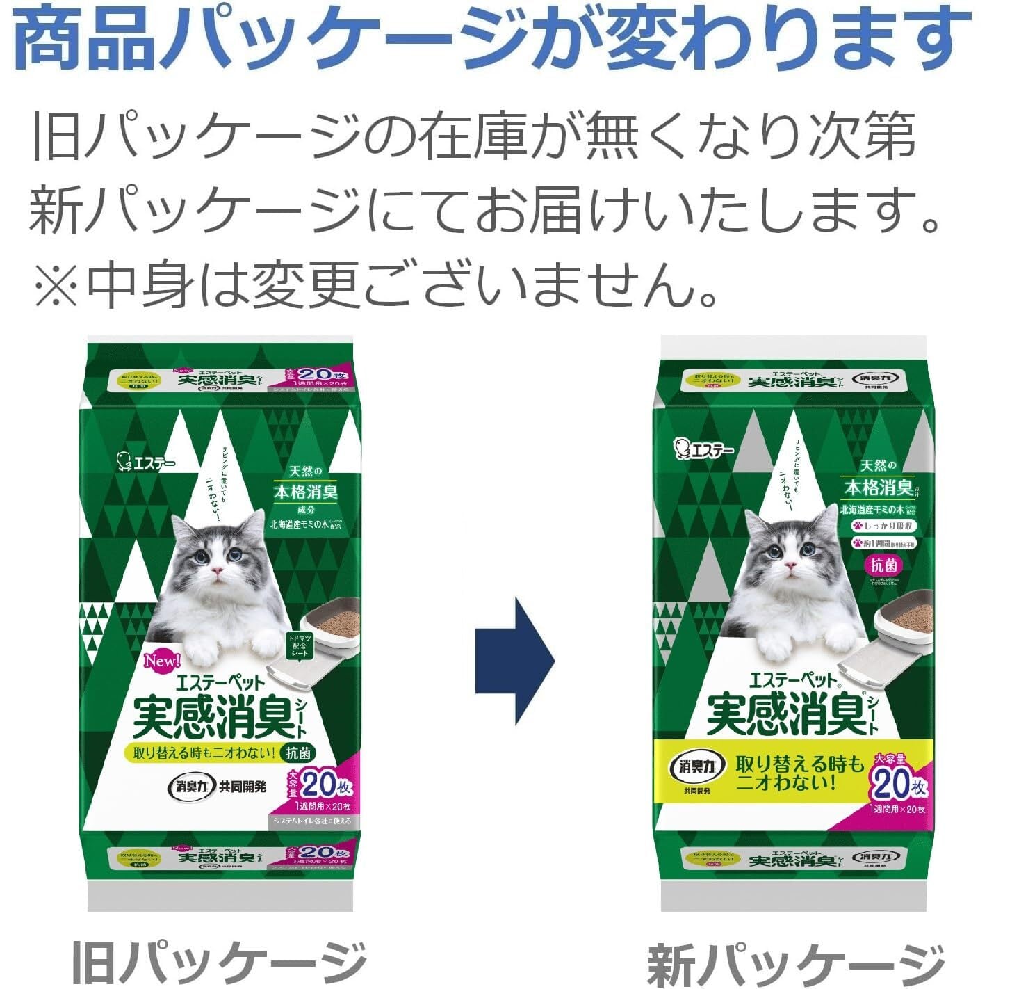 ●天然の本格消臭成分、北海道産モミの木(トドマツ)の粉体とクエン酸配合で、オシッコのニオイに高い消臭効果を発揮します。●「実感消臭シート」は1週間分のオシッコをグングン吸収するので、お手入れの手間が減ります。●抗菌仕様のシートです。※すべての菌に効果があるわけではありません。●1週間ニオイの広がりを抑えるので、安心して使えます。●シートの表面が白くオシッコの色がわかりやすいので、健康状態をチェックできます。 使用方法 ●本製品は引き出し付きシステムトイレ用の吸収シートです。単体で犬用トイレシート(ペット用トイレシート)として使用しないでください。※直接猫ちゃんが触れるように使用すると、シートが破れ、中身が飛び出す、足裏が汚れるなどトラブルの原因となります。●「エステーペット 実感消臭チップ」と一緒にご使用いただくと、効果的です。●「エステーペット 実感消臭チップ」以外の商品と組み合わせて使用すると十分に効果が発揮できない場合があります。●シート寸法(43cm×29cm)をご確認の上ご使用ください。※シートは外側がツルツルのフィルム面、内側がザラザラの吸水面になっています。フィルム面を下にしてセットしてください。●(1)トレイを引き出し、フィルム面を下にして敷いてください。●(2)シートがずれないようにゆっくりとトレイを奥まで押し込んでください。●(3)スノコの上にチップを入れてください。※シートを振り広げると、中の吸収体が偏ったり、製品が破れる恐れがありますので、注意してください。※シートを切ると、中身が飛び散りますので、切らずに使用してください。