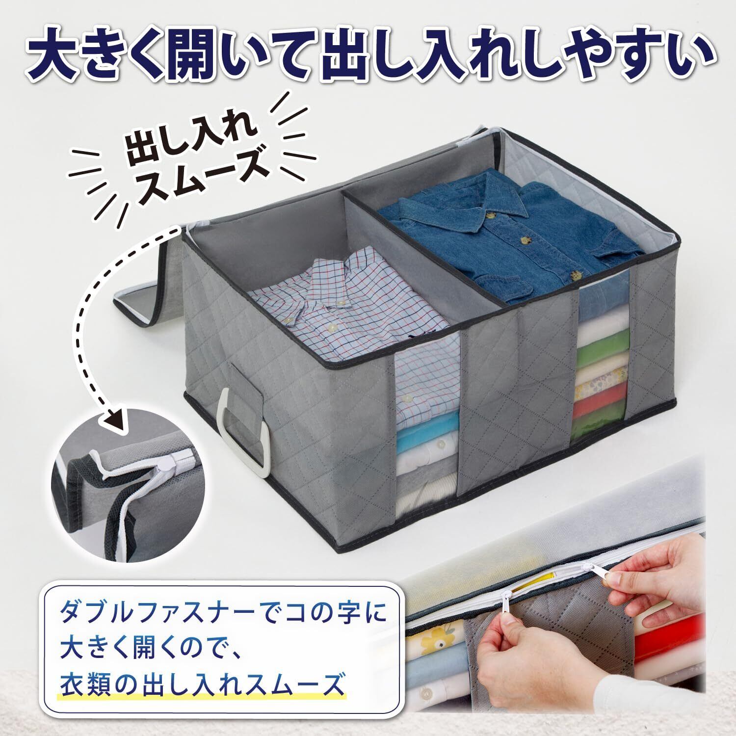 【ハンドル付き・衣類が出し入れしやすい】:両サイドに持ち手付きでクローゼットや押入れからの出し入れ、移動も簡単。コの字ダブルジップファスナーで3辺が開くので、衣類の出し入れがスムーズ。