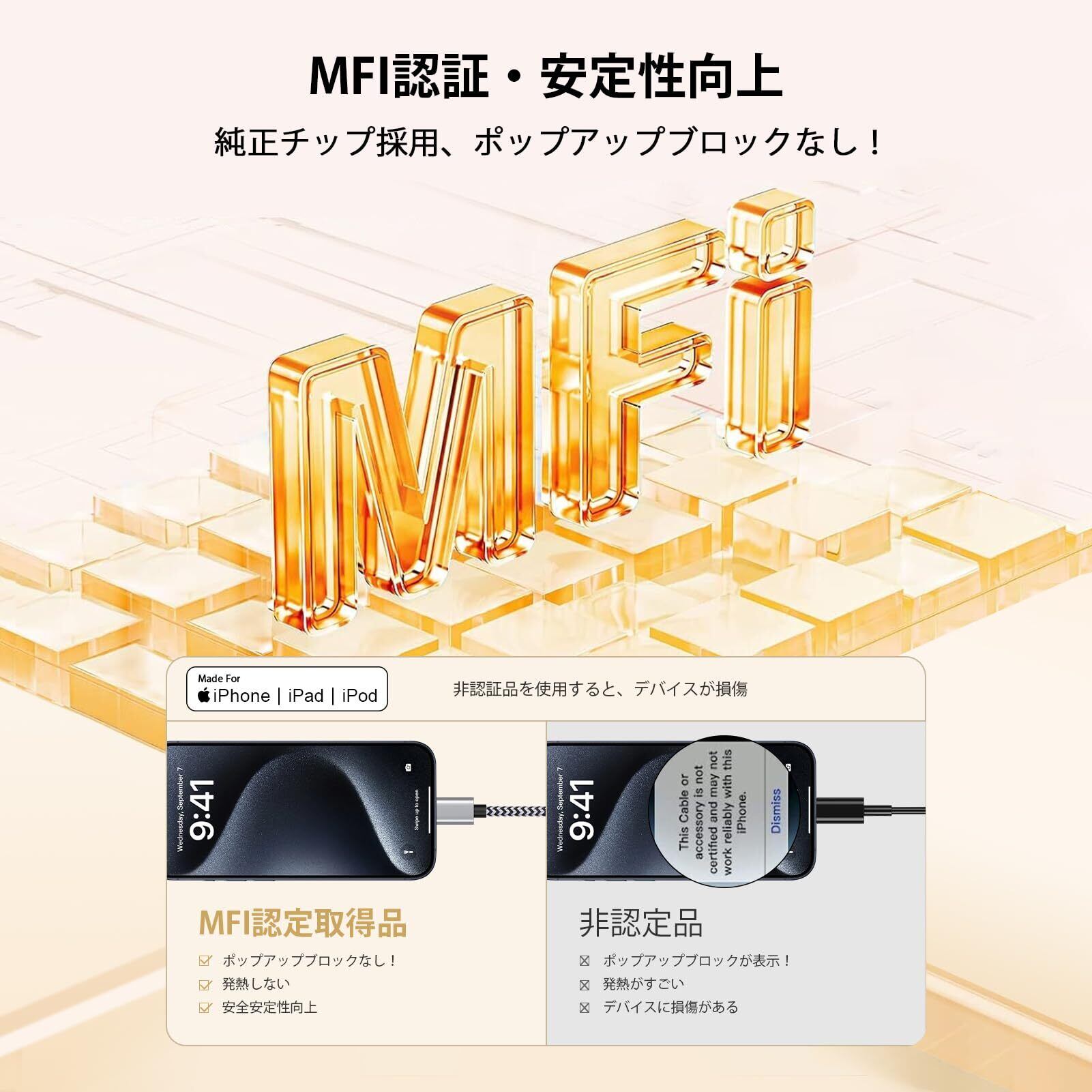 【A p p l e認証済み】 Appleの正規ライセンス「Made for iPhone/iPad/iPod」を取得した製品で、Appleデバイスと完全な安全に接続し、エラーメッセージなしでiOSシステムと103%互換性があることを確認します。ご安心購入ください。(ご注意、本製品は通話機能はなく、音楽コントロールはできません。)