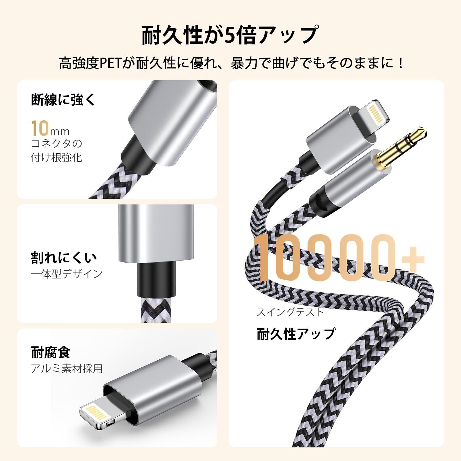 【Hi-Fi高音質・忠実に音を再現】このiphone 音楽ケーブルは最大24bit/48kHzの高音質出力を提供するDACチップが搭載されており、安定した高精細オーディオを実現してCDスペック同等の優れた音質を楽しめます。断線を予防し高音質を保つエナメルリッツ銅芯と24Kメッキ端子素材を採用し、そして良質素材採用の6重シールドを施し、長期間の使用による信号劣化の心配が少なくノイズの干渉を有効防止。