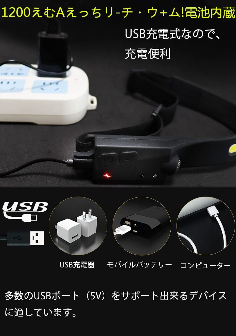 【ヘッドライトUSB充電式・優れる耐久性】1200えむえーえっちのリ-チ・ウ+ム充電池が内蔵(USBケーブル付属)しており、電池交換不要なので、お金の節約はもちろん、環境にもとても優しいです。絡みにくく、ねじれにも強い従来より30%太い極太配線を採用し、落下衝撃から身を守ってくれます。高品質ポリカーボネートを採用しており、雪山やレスキューシーン等を想定できる急激な温度変化にも対応してくれます。