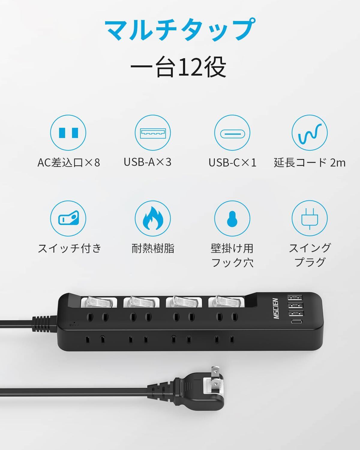 【一台12役・USB付き・延長コード】1つのUSB-Cポート、3つのUSB-Aポートと8つのAC差込口を搭載したマルチタップです。延長コードを採用し、コンセントから離れた場所で使えます。
