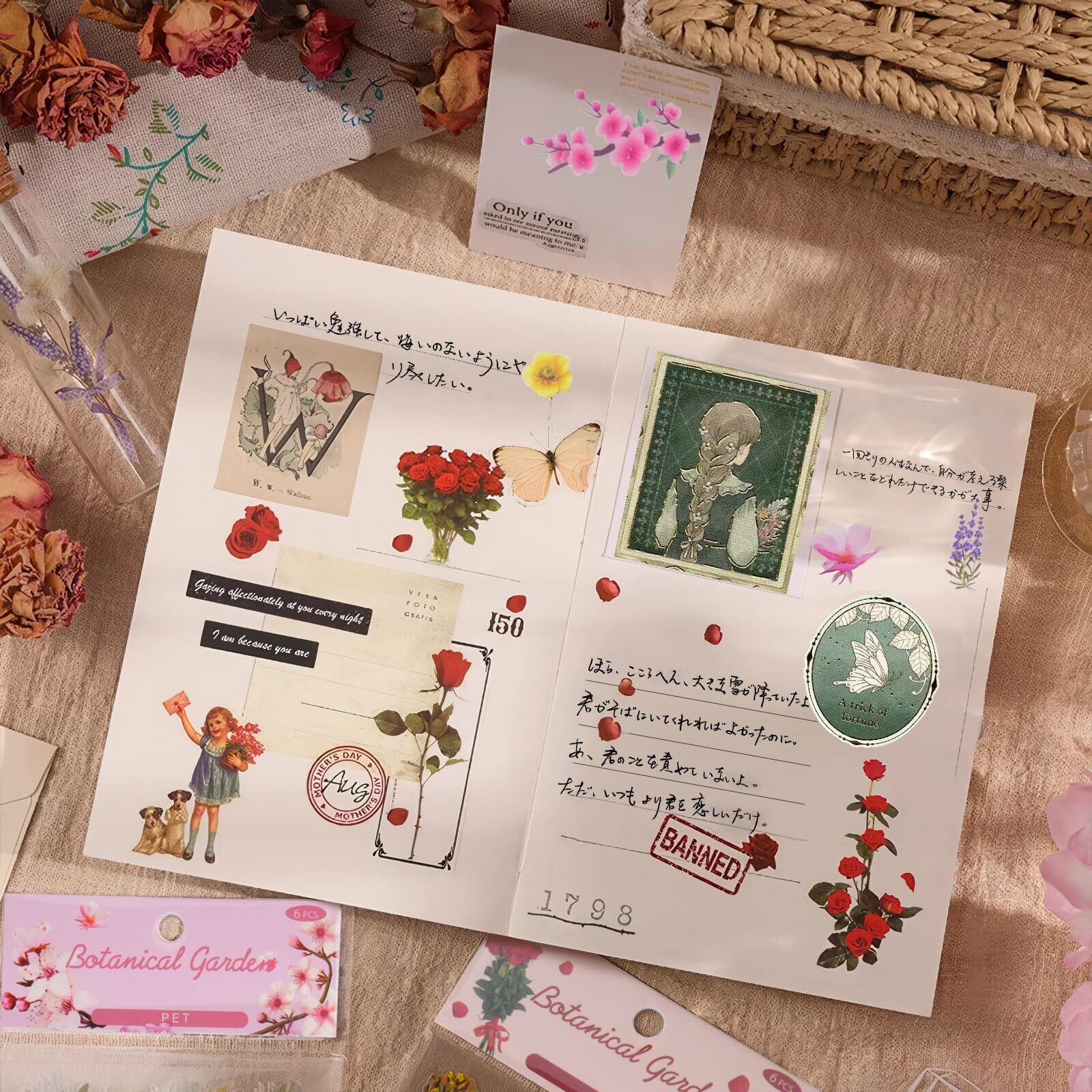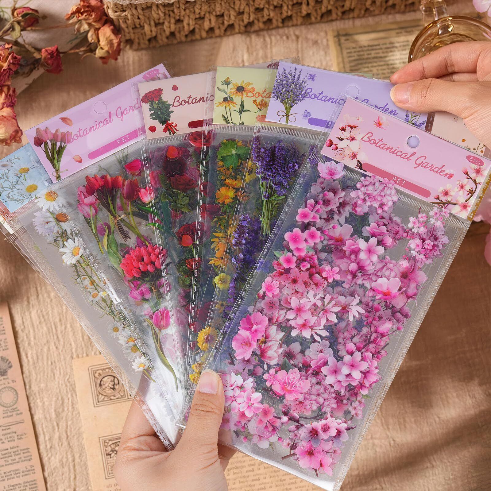 【大容量のコラージュシール】桜やチューリップ、ラベンダー、ひな菊、ひまわり、バラのステッカーは各6枚入りのセットが6冊あり、合計666枚です