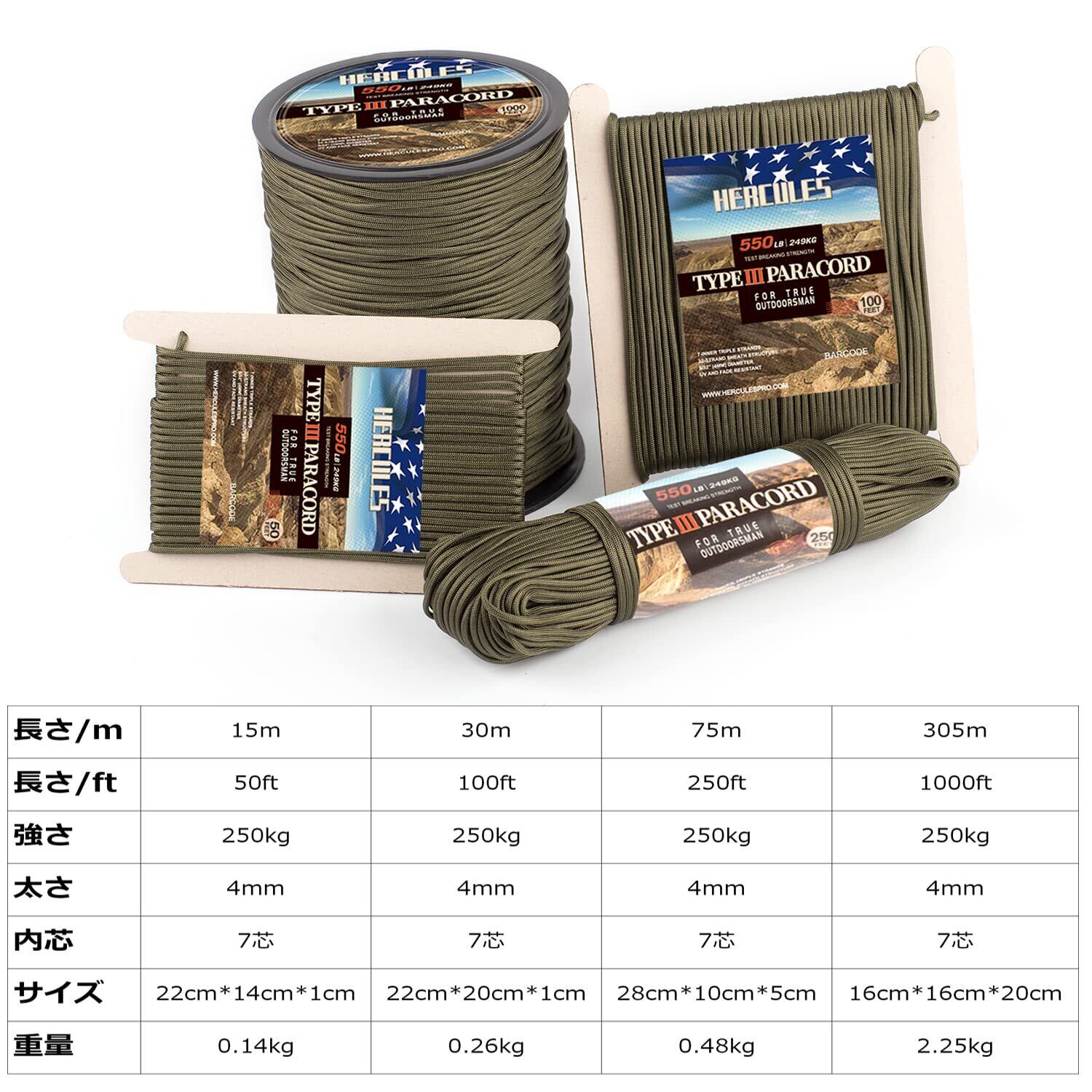 HERCULES パラコード ガイロープ キャンプロープ テントロープ アウトドア 用 耐荷重250kg 7芯 アーミーグリーン 15m