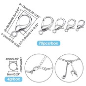 サイズ:カニカン:約6~13mm幅、10~20.5mm長さ、3.5~5.5mm厚さ、穴:1~2mm、約70個/箱、リング:約6mm直径、4mm内直径、1mm厚さ、約4g/箱.