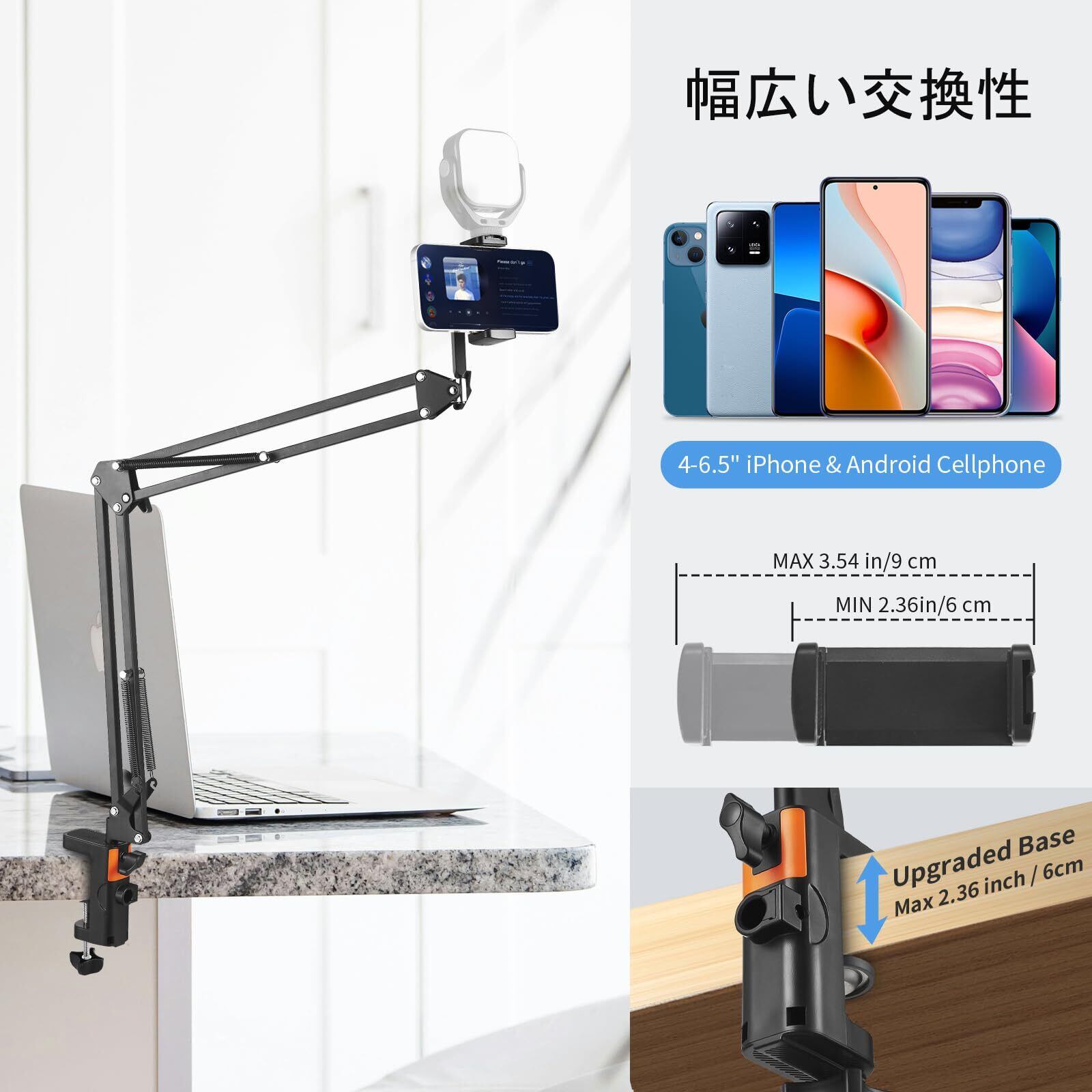 ▶【汎用性高い、多機種対応】スマホクリップはミニビデオライトに差し込むことが可能です(このセットにはLEDビデオライトは含まれていません)。幅広いスマホクリップは6cmから9cmまで延長可能で、3.5~6.5インチのスマホに対応しています。例えば、iPhone 14/14 Pro/Mini/XS/XS Max/XR/X/8/8P/7/7P/6s/6、Google Nexus、Samsung S10/S9/S8/Note 10などです。撮影、ライブ、在宅勤務などに、卓上、ベッドサイド、寝ながらスマホスタンドとして大活躍し、肩こりなくて長時間に快適に楽しめます。もし届きました製品何かの問題がありましたら、交換・返金などを希望する場合はぜひ当店までご連絡してください。