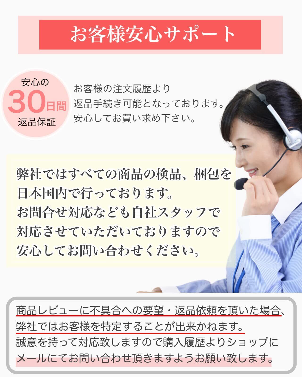 弊社商品は日本国内で1点1点手作業で検品を行なっております。お客さまに喜んで頂ける様丁寧で確実な検品を心掛けておりますが万が一不具合などございましたらメールにてお問い合わせください。また30日間の返金対応も行っておりますので安心してお買い求め頂きたいと思います。