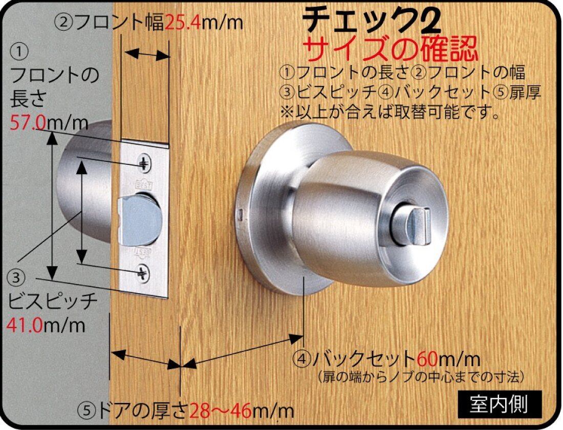 チェック2:1、フロントの長さ57ミリ 2、フロント幅25.4ミリ 3、ビスピッチ41ミリ 4バックセット60ミリ(扉の端からノブの中心までの寸法) 5、ドアの厚さ28~46ミリ