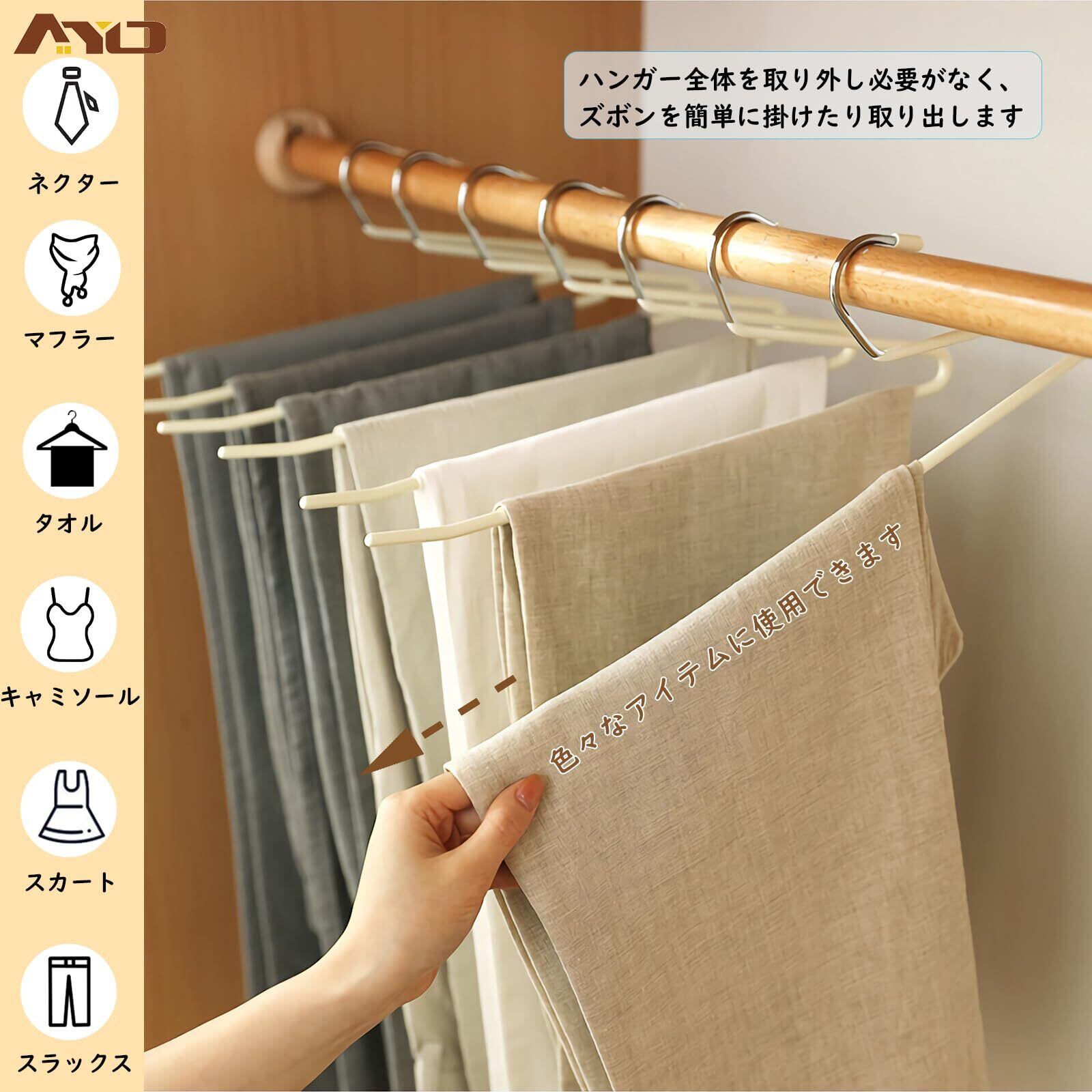 【色々なアイテム】ハンガーは合金鋼製の省スペースな作り、ズボンを並べてかけても全体のボリュームが抑えやすく、片側がオープンになっているので、掛けやすく、取り出しやすいです。スカート、パンツ、タオル、スカーフ、ネクタイ、アクセサリーなどを掛けるのにぴったりです。