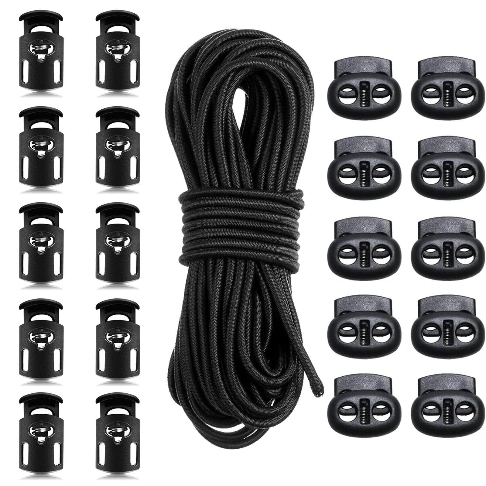 サムコス ゴム紐 コードロック 21点セット 2.5mm×10m 弾性コード 20個入スプリングコードストッパ 衣類 リュックサック 運動服な 耐久 軽量 スプリングコードストッパー 補修用 DIY用 (ブラック)
