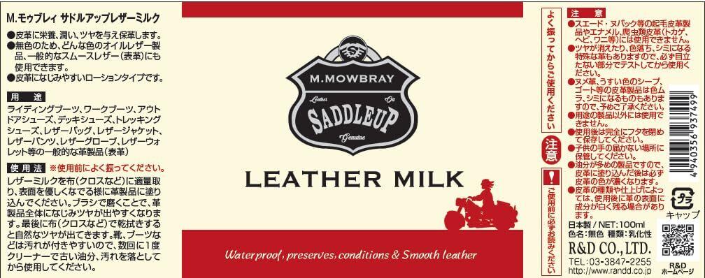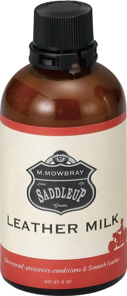 革を乾燥から守り、ツヤを与える保湿ミルク「サドルアップ レザーミルク」カルナバワックス、蜜蝋、ラノリン、ホホバオイル、シアバターといった天然由来成分を豊富に配合しています。スッと革へ浸透し、まんべんなく栄養を与えます。