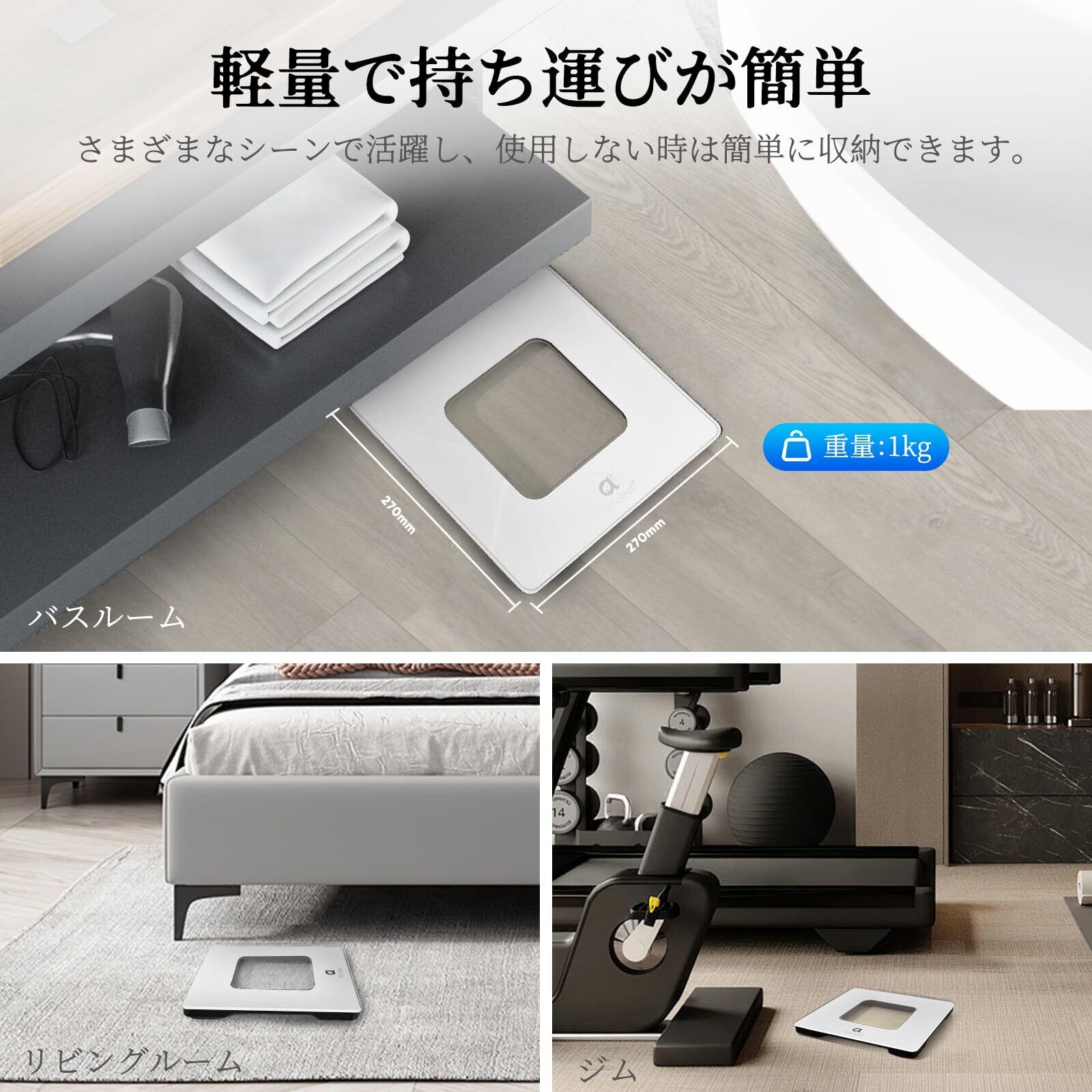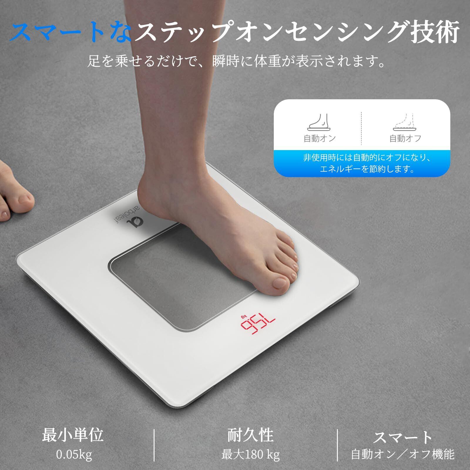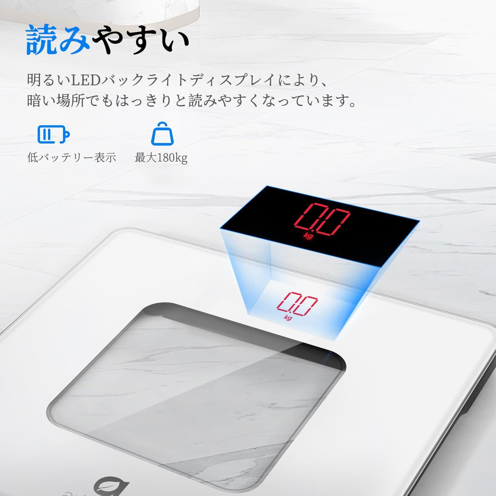 Arboleaf【新登場・高精度・薄型】体重計 ヘルスメーター ボディスケール 乗るだけ簡単測定 電源自動ON/OFF バックライト付き 強化ガラス製 180kg対応 あすけん/Apple Watch/Appleヘルスケア/Fitbit/Google Fit と連携可能 コンパクト設計 軽量 電池付属 一年