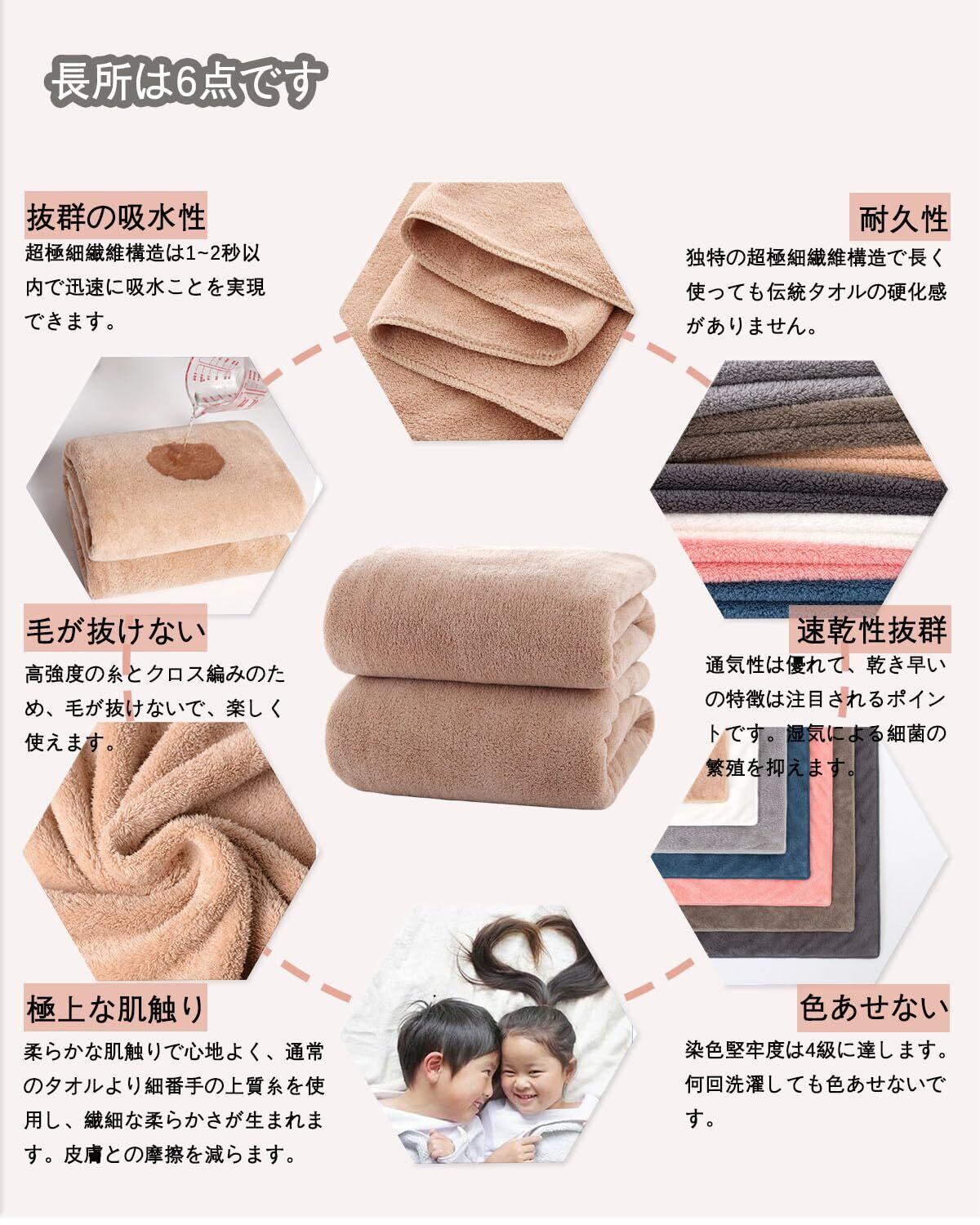 【抜群の吸水性と速乾性】綿の素材より吸水性が優れます。マイクロファイバー素材の表面は数えられない隙間があり、その隙間に大量の水分を素早い吸水できます。髪や肌にそっと当てるだけで水分が吸収される素材であり、また汚れも落としやすい特徴があります。隙間に取り込まれた空気が水分を拡散させるので、速乾性のポイントで、バスタオルの雑菌を抑え、健康を保つことができます。