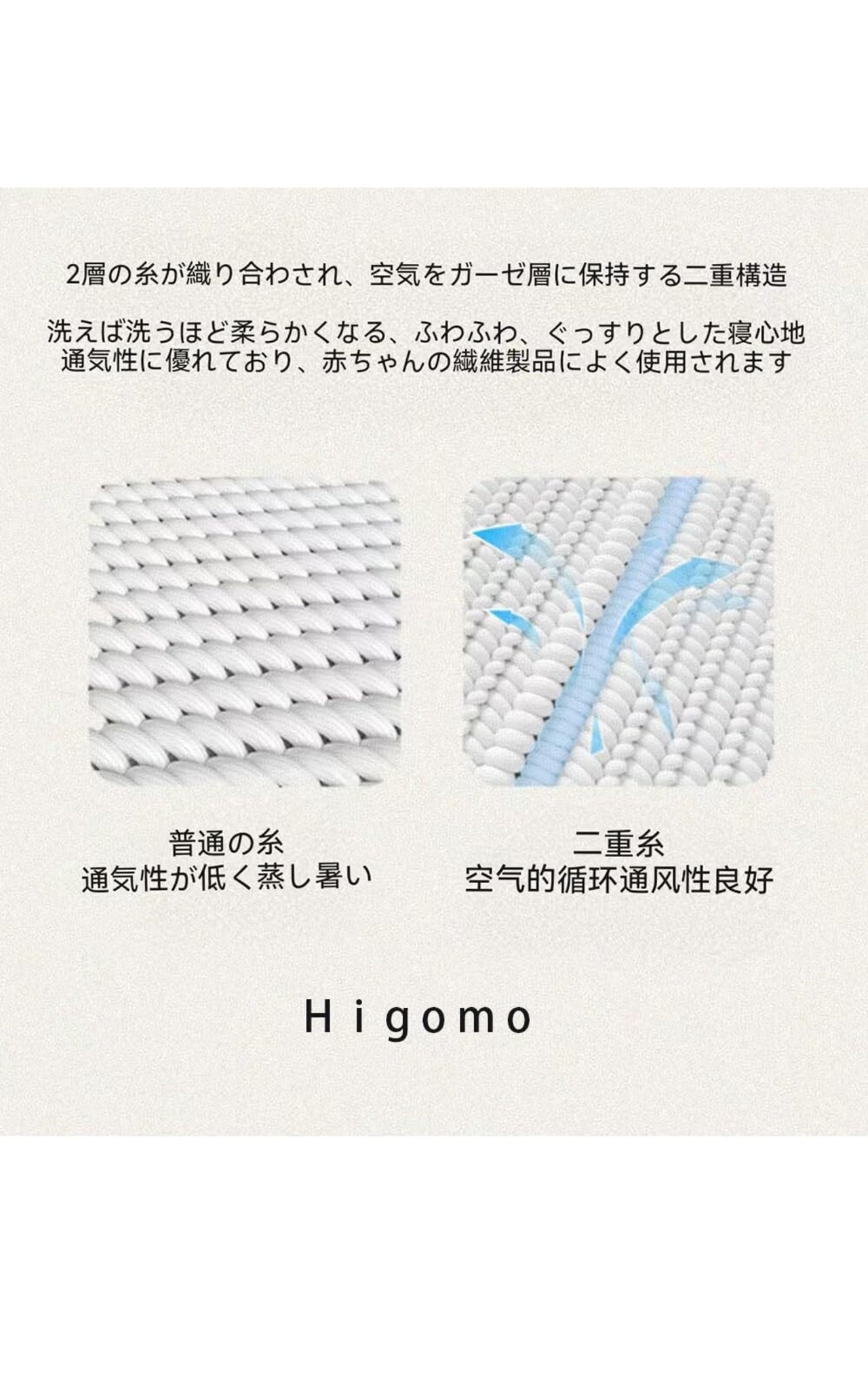 Higomoは天然素材コットンで作られており、生地は快適で柔らかく、耐久性があり、毛玉やダニがつきにくいです。綿自体が吸湿性・通気性に優れており、肌に優しく、とても快適にお休みいただけます。さらに、コットンには抗菌・防臭効果があるため、夏の暑い時期でも、枕カバーをあまり取り替えない冬でも、頭皮の健康を守ることがでます。 【200本の高密度】「本」は生地の織りの密度の単位で、具体的には打ち込み本数(スレッドカウント)であり、1インチ四方に織り込んでいる糸の総本数を指します。数値が大きいほど、生地は滑らかで柔らかくなります。HIGOMOの純綿枕カバーは1インチ四方あたり200本の糸が織られており、雲のように柔らかな手触りがあります。ガーゼ綿は通気性が強いので洗えば洗うほど柔らかくなります。
