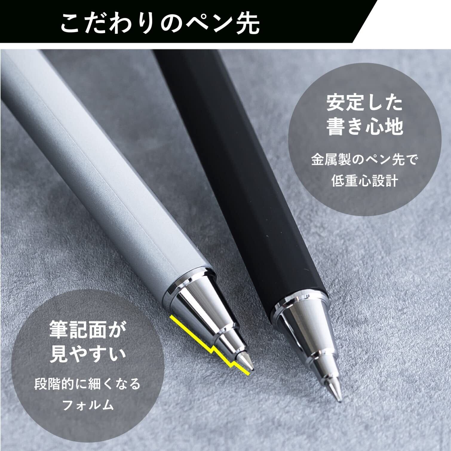 光沢のあるシルバークリップが上質感溢れるデザインに。クリップからペン先までシルバーのワントーンでまとめた0.4mm。ブラックとシルバーのコントラストを活かした0.5mm。