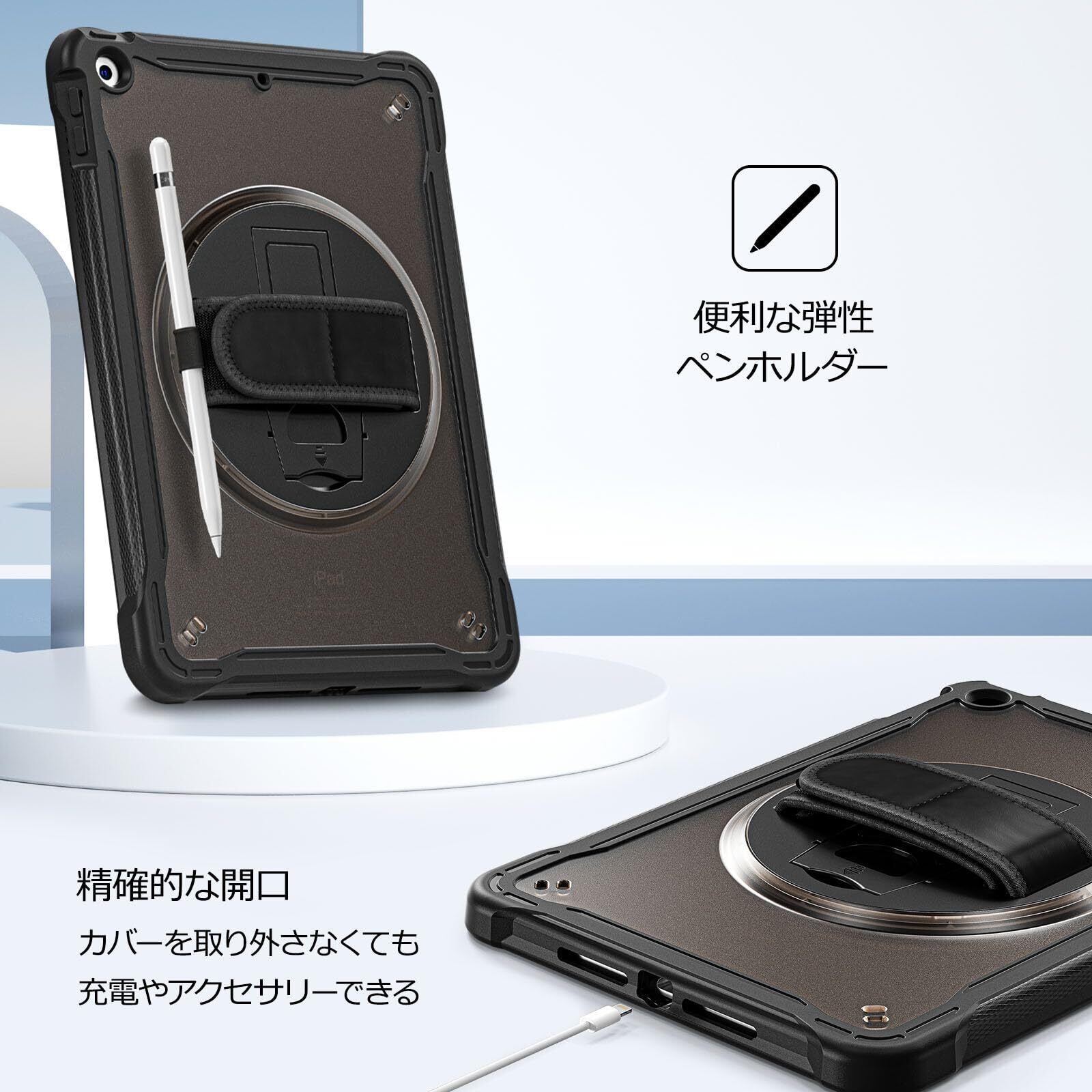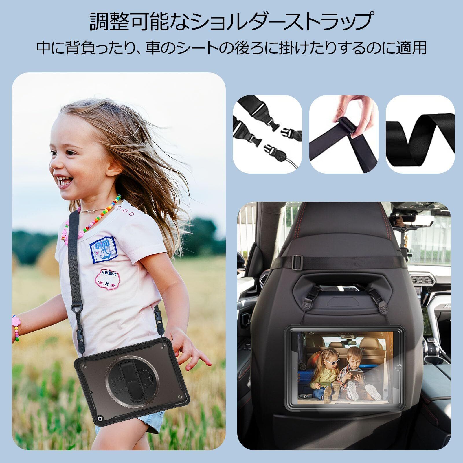 ProCase iPad 9/8/7 ショルダーケース 10.2”肩掛け式 子供用 耐衝撃 半透明カバー ペン収納 360°回転スタンド 手首付き 3層保護 (ブラック)