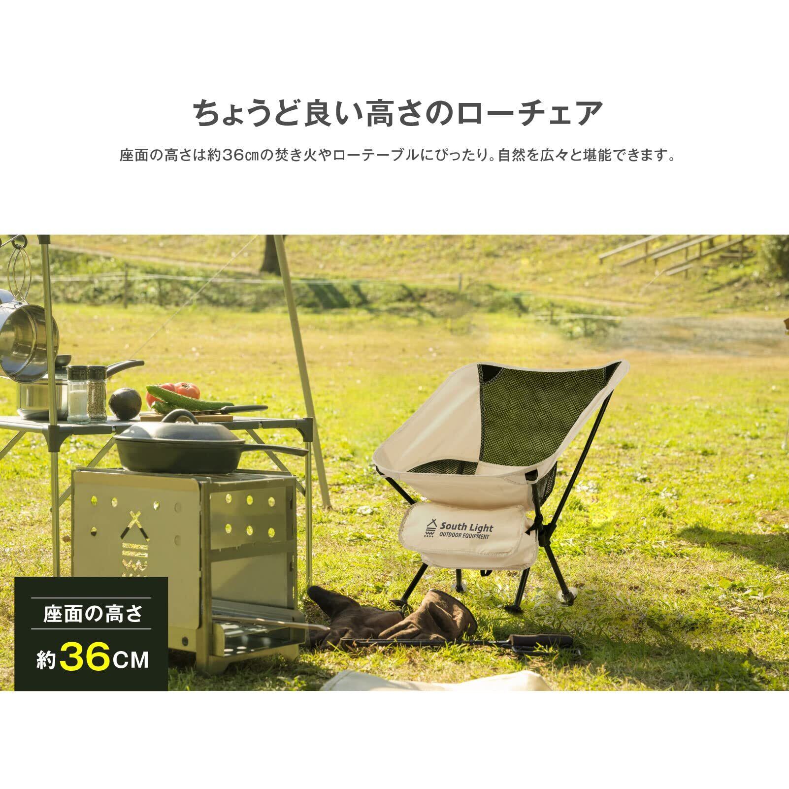 【キャンプ・レジャー / 小型組み立て式簡易チェア】キャンプやレジャーなど快適なSouth Lightの小型の組み立て式チェアです。座面部分と骨組みの一人用タイプですが、耐荷重は150kg。体重をしっかり預けることができますので安心して身を任せることができます。全身を包み込んでリラックスできる座り心地です。座面高さ41cmは高すぎず、焚き火やローテーブルにぴったり。テント内でも隅に寄せて使えますので、テント内のスペースをより有効に使うことができます。