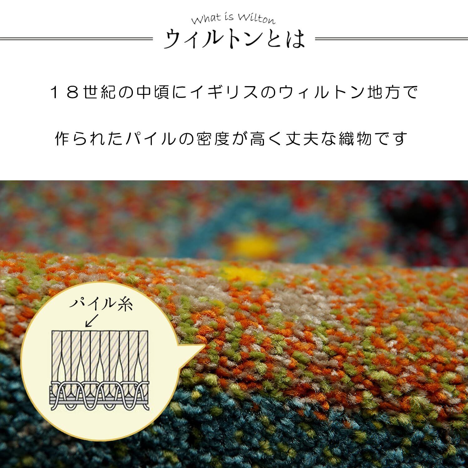 トルコ製のウィルトン織りマットです。ギャベ柄を落ち着きのある色合いのグラデーションでまとめました。ウィルトン織りは非常に耐久性の高い織物です。家の中でも靴を履いて生活するヨーロッパで、土足で扱うことを前提として作られておりますので、長時間踏みつけてもヘタリにくく、弾力性もあり長くご使用頂けます。本商品の『繊維の密度を表すノット数』は112,000ノットです。本商品のパイル部分にはポリプロピレン素材を使用しております。ポリプロピレンはヘタリにくく、耐久性に優れ、繊維の中でも軽い素材です。また、汚れが付着しにくく、遊び毛や毛玉が非常に出にくいという特徴もあります。本商品にはフリーゼセット加工を施しております。フリーゼセット加工でパイルをツイストすることによりボリューム感を出し、ふかふかとした肌感触に仕上げました。