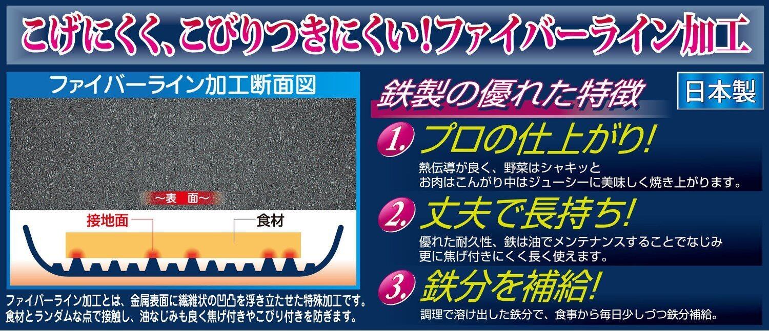 こげにくく、こびりつきにくいファイバーライン加工(ファイバーライン加工とは:金属表面に繊維状の凹凸を浮き立たせた特殊加工です。食材とランダムな点で接触し、油なじみも良く焦げ付ききやこびり付きを防ぎます) 鉄製で料理もプロの仕上がり。 丈夫で長持ち。