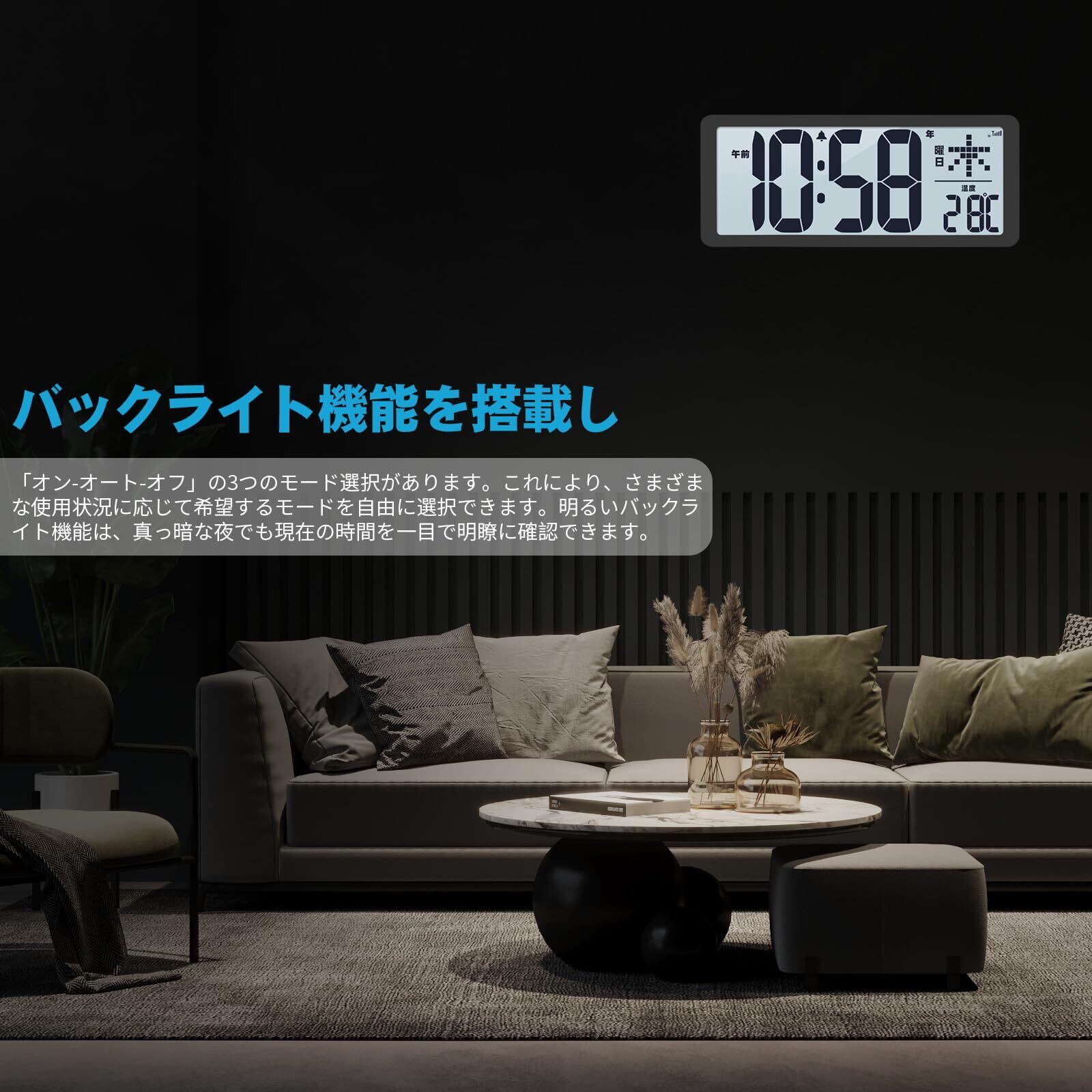 【多機能・大型デジタル時計】サイズ:36×15×3.5cmの超大型デジタル時計。主な機能:① 電波受信機能、② 目覚まし時計、③ 2段階調光、④ 自動光感応機能、⑤ 全視角表示、⑥ 日付/温度サイクル表示、⑦ ℉/℃切替、⑧ 12/24時間表示切替、⑨ 記憶機能、⑩ スヌーズ機能、⑪ 一括停止機能、⑫ 壁掛け/卓上設置可能、⑬ 正転・逆転タイマー。