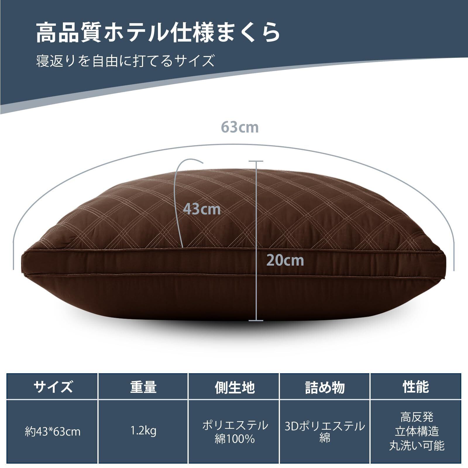 【新春セール】HEVUMYI 枕 まくら 首が痛くならない安眠枕 高反発枕 立体構造 ホテル仕様 43×63cm 横向き対応 丸洗い可能 通気性よい 長さ63cm*幅43cm*高さ20cm(ブラウン)