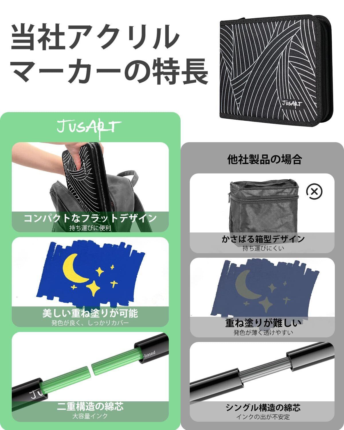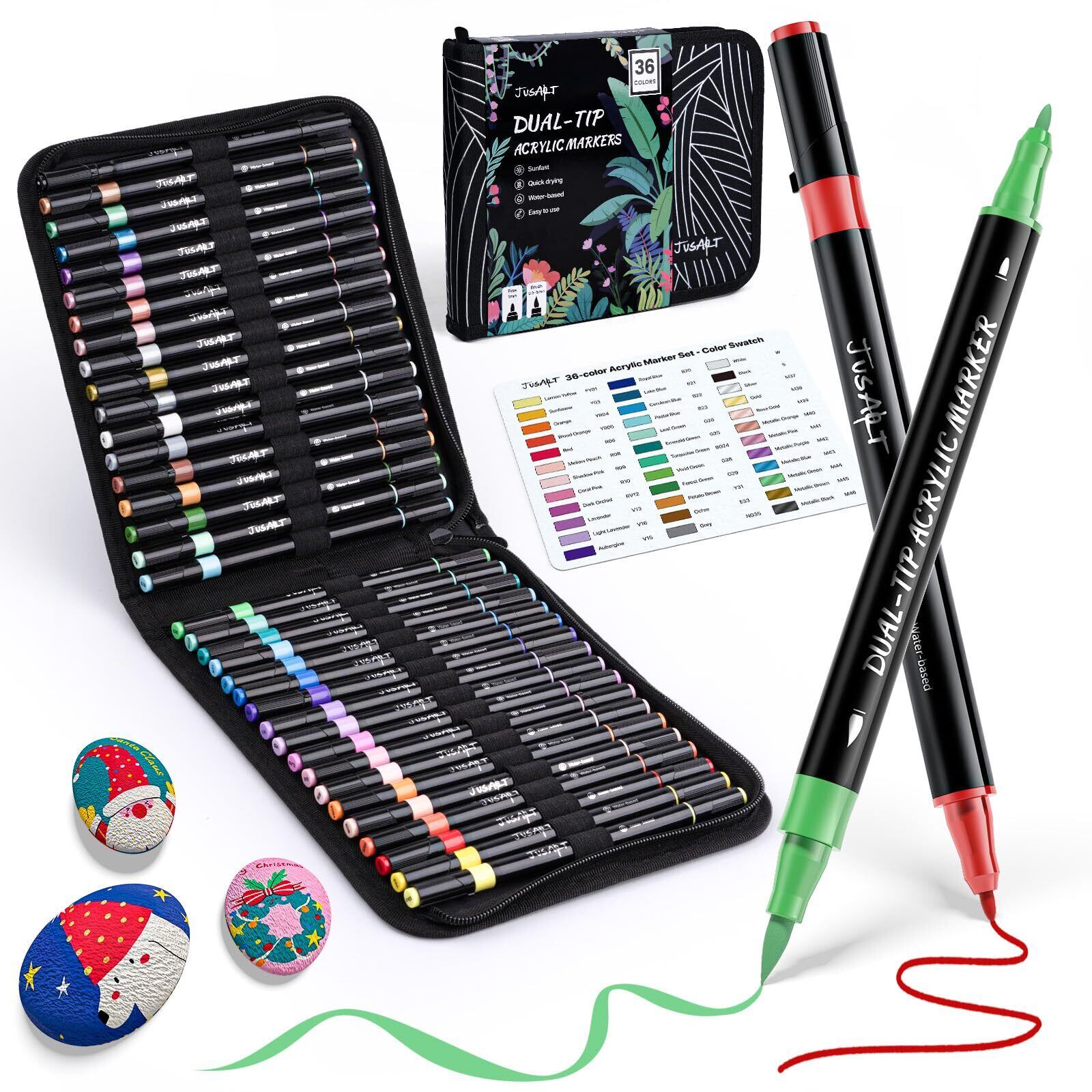 JusArt アクリルマーカーペン 36色セット ペイントマーカー 筆先 細字先両端 アクリル絵の具 イラスト アートマーカー カラーペン 水性 布/ガラス/プラ/石/木材/陶器/金属に書ける メタリックカラー 防水 速乾 耐水 お祝い プレゼント