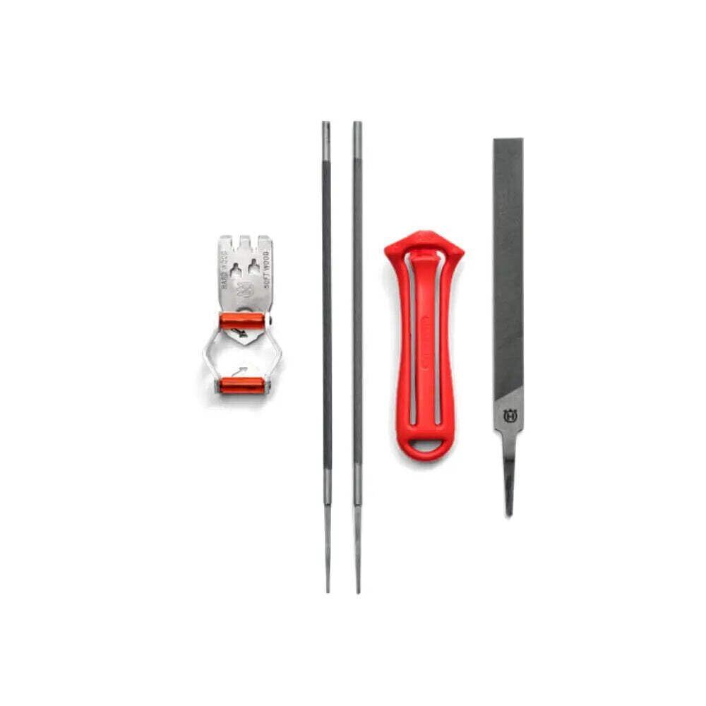 チェンの目立てに必要な、丸やすり・平やすり・やすりハンドル・目立てゲージの4点セットです。