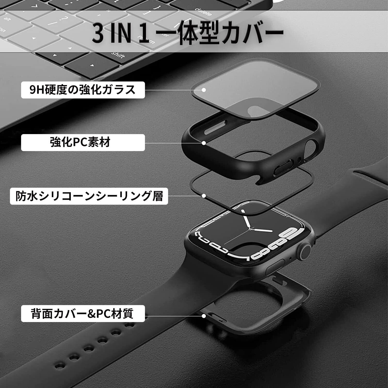 【究極の一体感】3 in 1一体型カバー(背面カバー+ガラスフイルム+側面カバー)。アップルウォッチを基に、精確に設計されておりぴったりとアップルウォッチと密着しボタンまで守り、抜群の一体感です。そして、バンド部分との干渉もなく、保護ケースを装着したまま充電出来とても便利です。