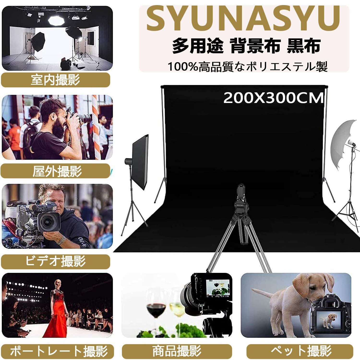 SYUNASYU 背景布 黒 200 x 300 cm 暗幕力一テン 撮影用背景シート 折りたたみ 遮光 布 無地 黒い布 背景スタンド ポール対応 黑布 バックスクリーン 100%ポリエステル 暗幕 2m x 3m