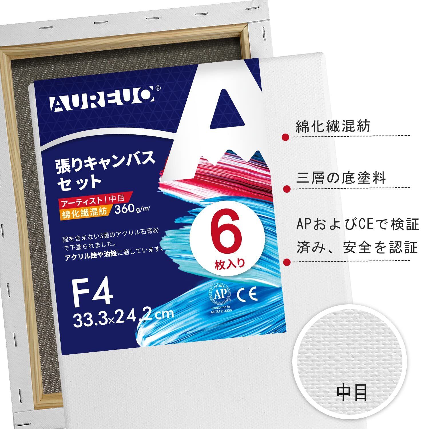 【人気商品】AUREUO 綿化繊混紡 張りキャンバス F4 (33.3cmX24.2cm) 6枚 - 中目布纹 水彩画・油絵画・アクリル兼用 - モダンアート・ポップアートに最適