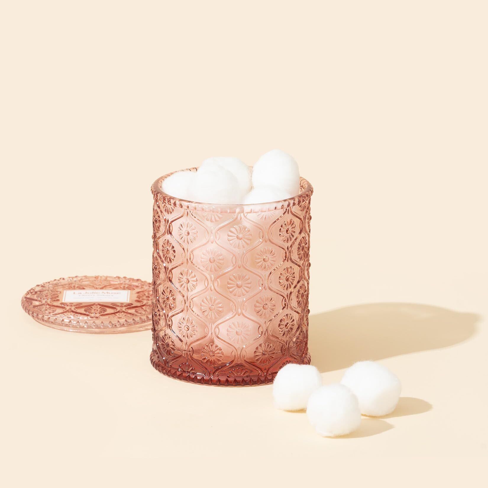 ジャーキャンドル- デイジーを施した高級感のあるグラスジャー。お部屋のインテリアにもぴったり。キャンドルとして使用し終わった後も、花瓶、ブラシホルダー、収納ジャーとしてお使いになれます。