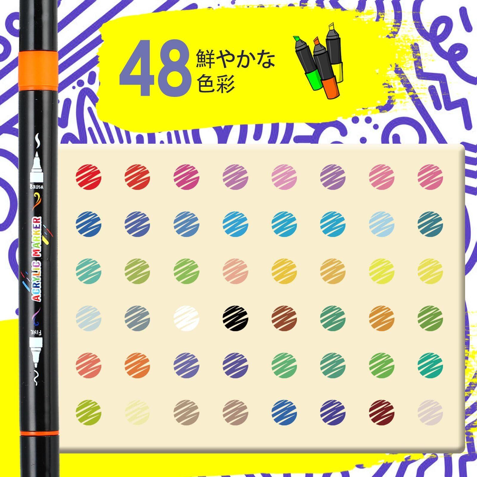 アクリルマーカー セット 48色 カラーペン 水性ペン 毒性無し 防水 速乾 耐光 太細両端 プラ板/ガラス/陶器/木材/布/石に書ける ハンドメイド DIY 子供用 学校 絵画教室 プレゼント