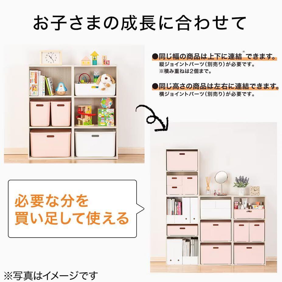 ●タテ・ヨコ連結できるカラーボックス●同じ幅の商品は上下に連結できます。※縦ジョイントパーツ(別売り)が必要です。※積み重ねは2個まで可●同じ高さの商品は左右に連結できます。※横ジョイントパーツ(別売り)が必要です。【お客様組立品】●プラスドライバー必要●組立てパーツ在中【耐荷重(約)】棚板1枚あたり(ダボ固定の場合):10kg棚板1枚あたり(木ネジ固定の場合):20kg【サイズ(約)】外寸:幅41.9×奥行29.8×高さ87.8cm内寸:幅39×奥行26×高さ85cm棚板の厚さ:12mm(※側板も共通)棚ピッチ(棚穴の間隔):32mm【材質】パーティクルボード