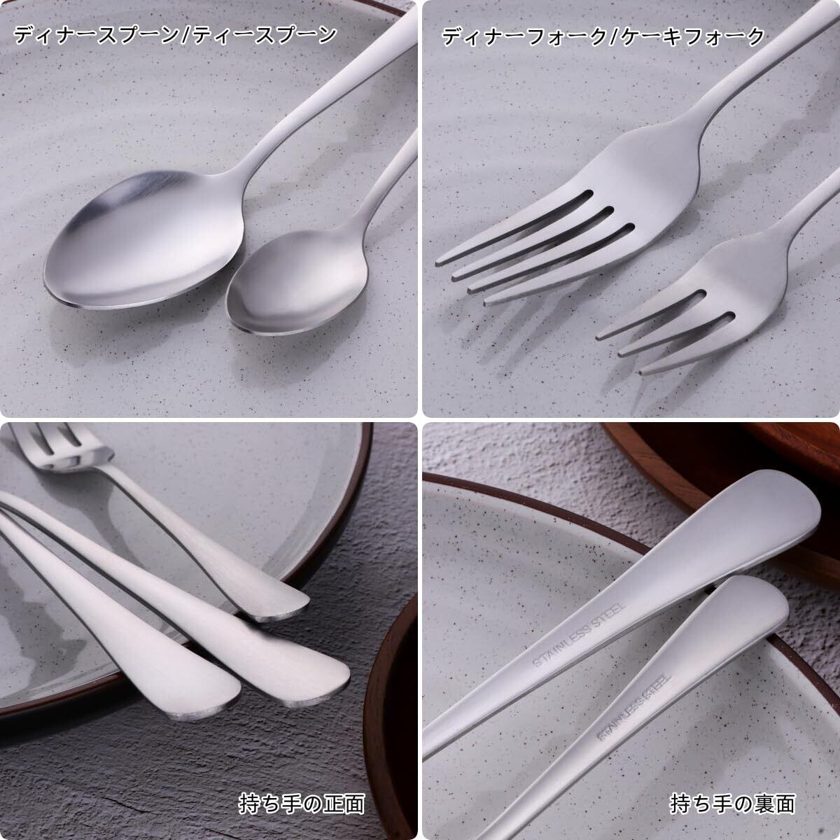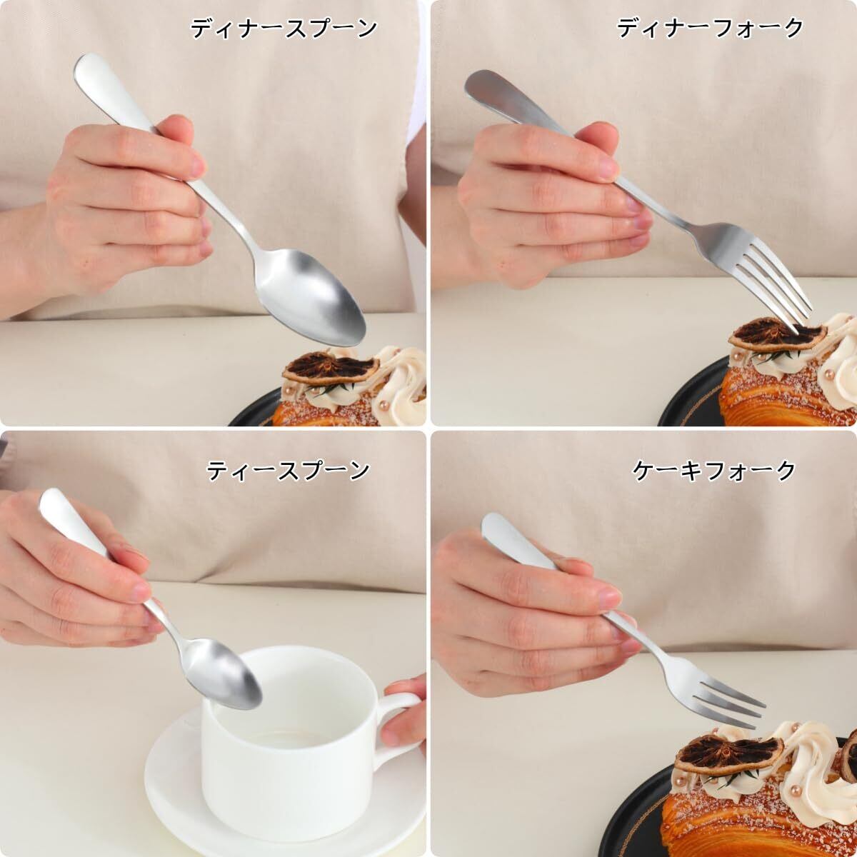 【実用なスプーンフォークセット】:ちょうどよいサイズ感と手に馴染みやすい持ち手です。ワンセットがあれば、日常の食事に十分に対応できる。ディナースプーンはカレーライス、炒飯、スープ等に適用、ディナーフォークはステーキ、パスタ、麺類等に適用、ティースプーンはコーヒー、ティー、デザート等に適用、ケーキフォークはケーキ、デザート、果物等に適用。