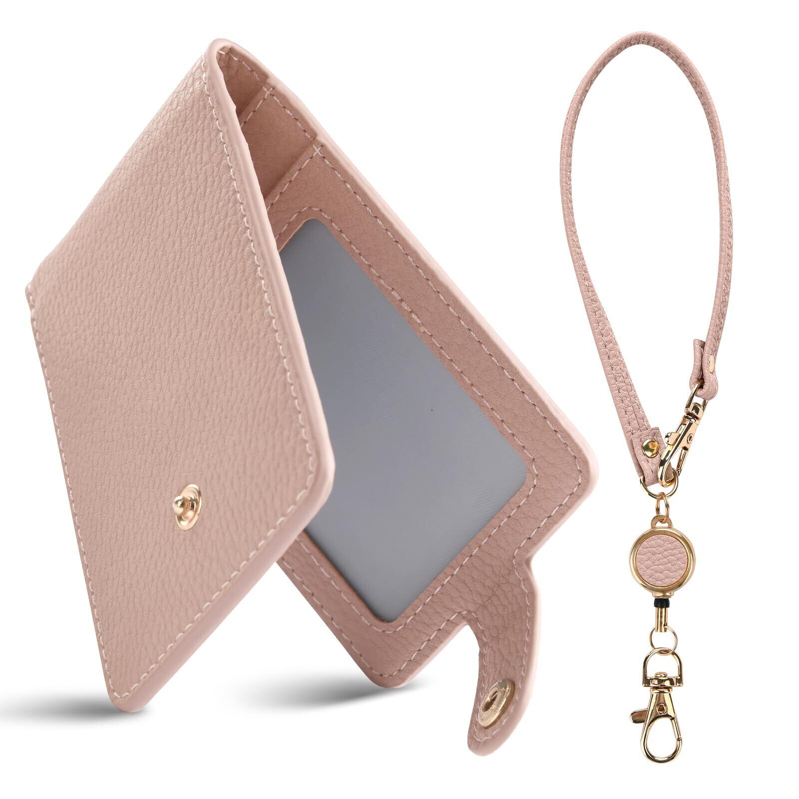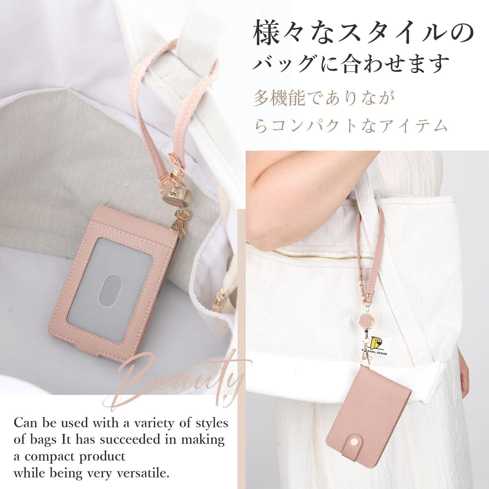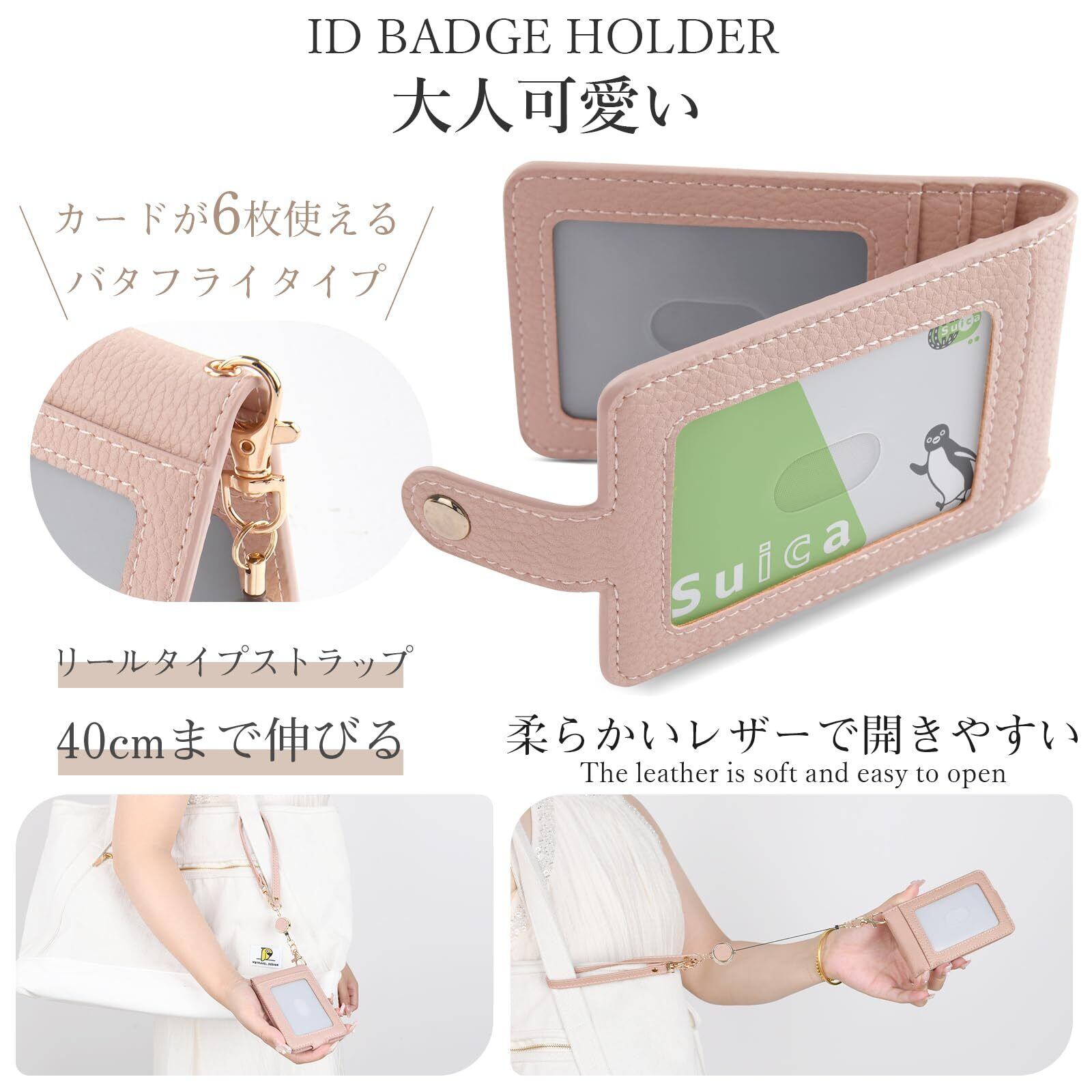 [Yeepan] 定期入れ パスケース パス入れ リール付き icカードケース カードケース 革 通勤 通学 ICカードケース ストラップ付き 3面 ICカード6枚使用可能バタフライタイプ メンズ レディース 極薄軽量-ベージュピンク