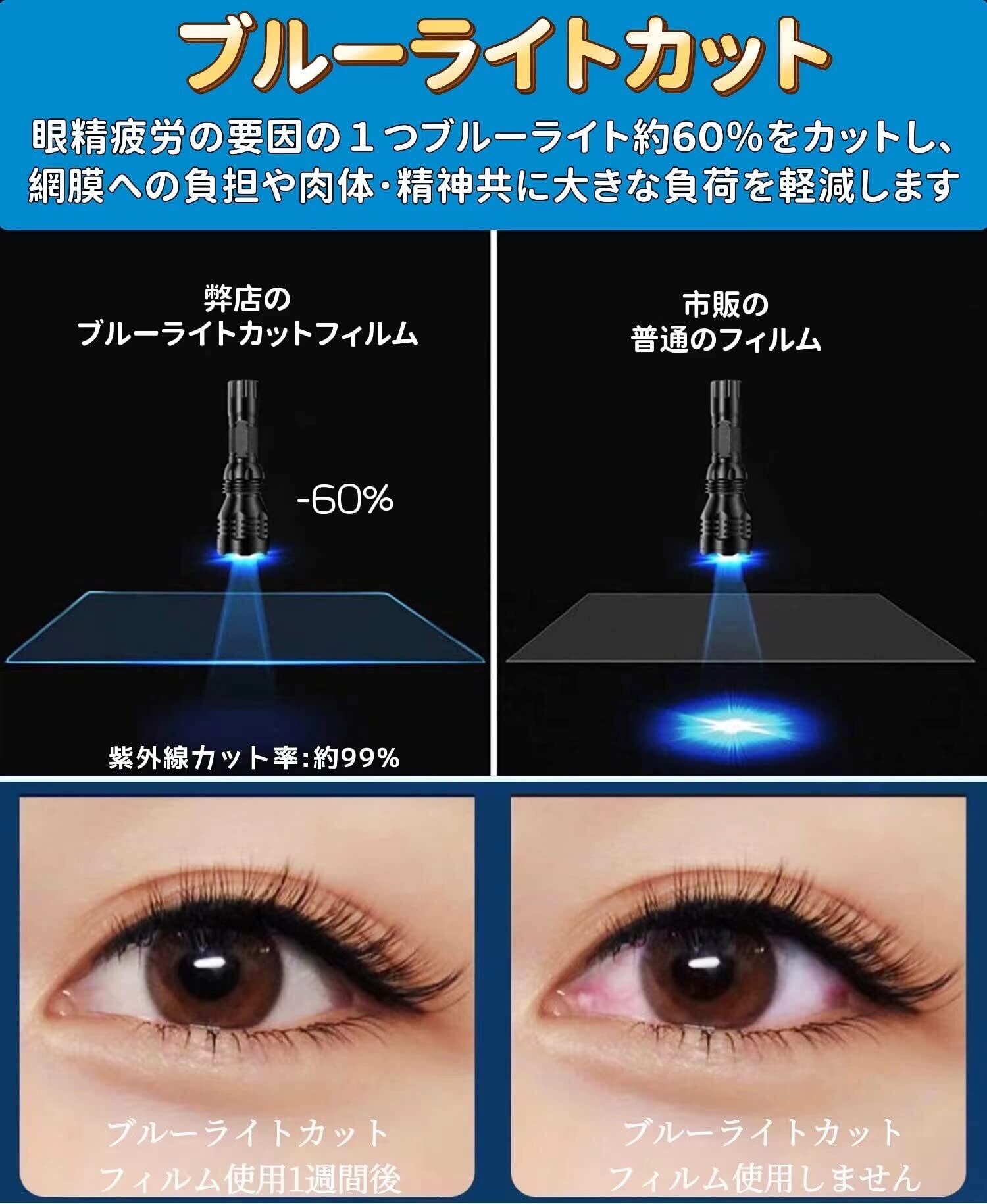 ディスプレイを見続ける機会が多い現代人の目を考えて開発のフィルムです。ブルーライトカットフィルムは液晶ディスプレイが発する光の中の青い部分「ブルーライト」最大約60%をカットできます、お子様の目を保護します。