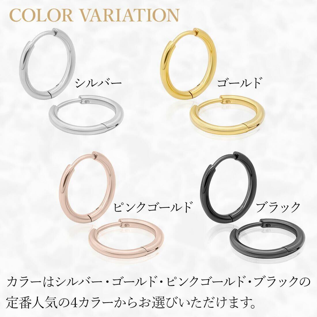 【豊富なカラー・サイズバリエーション】カラーをシルバー(銀)をはじめ、ゴールド(金)、ピンクゴールド、ブラック(黒)の人気の4色をご用意。ピアスのゲージ(軸の太さ)は18G(約1.0mm)、幅は細めの1.6mm、一般的な2.0mm、太めの2.5mmの3タイプ、内径サイズは8mm、10mm、12mm、14mm、16mm、18mm、20mmの小さめから大きめまで7サイズからお選びいただけます。お好みやスタイリングに合わせて選ぶ楽しみが広がります。