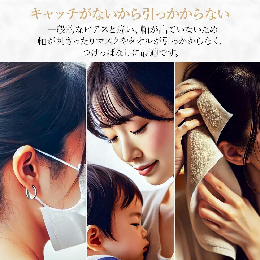 【キャッチが不要なワンタッチ装着】キャッチが不要な中折れ開閉式なので、キャッチをなくす心配もありません。装着もカチッとワンタッチで出来るので急いでいる時やピアス初心者の方でもでもカンタンに着脱できるのが便利です。一般的なピアスと違い、ポスト(軸)が出ないためマスクやタオルが引っかからいためつけっぱなしに最適。寝ているときに外れてる心配もありません。留め具部分を丸く加工しており、ピアスホールを傷つけにくくなっております。