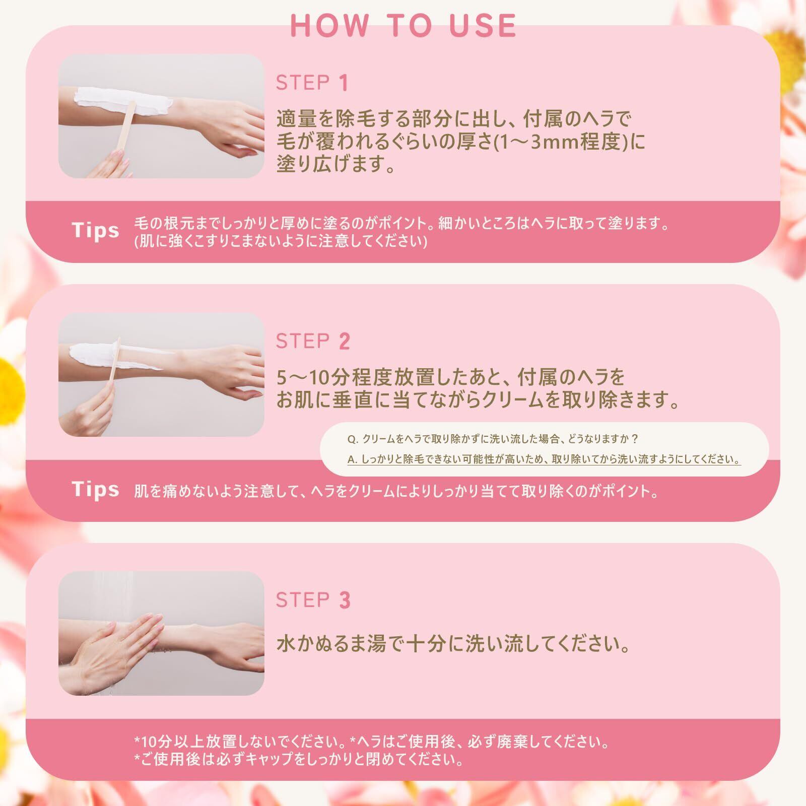 ●使用前に必ずテスト使用してください。あらかじめ除毛しようとする部位に少量塗り、約10分間放置し、かぶれ、赤み、はれ、かゆみ、強い刺激等の異常が生じたときは、使用しないでください。テスト後は水かぬるま湯で洗い流してください。特にお肌の弱い方は、2日後(48時間後)のお肌に異常がないかを確認の上、使用してください。 ●適量を除毛する部分に出し、付属のヘラで毛が覆われるぐらいの厚さ(1~3mm程度)に塗り広げます。毛の根元まで塗った後、表面をなだらかに。毛の根元までしっかりと厚めに塗るのがポイント。細かいところはヘラに取って塗ります。(肌に強くこすりこまないように注意してください。) ●5~10分程度放置したあと、付属のヘラをお肌に垂直に当てながらクリームを取り除きます。肌を傷めないよう注意して、ヘラをクリームによりしっかり当てて取り除くのがポイント。※10分以上放置しないでください。 ●水かぬるま湯で十分に洗い流してください。※ご使用後は必ずキャップをしっかりと閉めてください。※ヘラはご使用後、必ず廃棄してください。