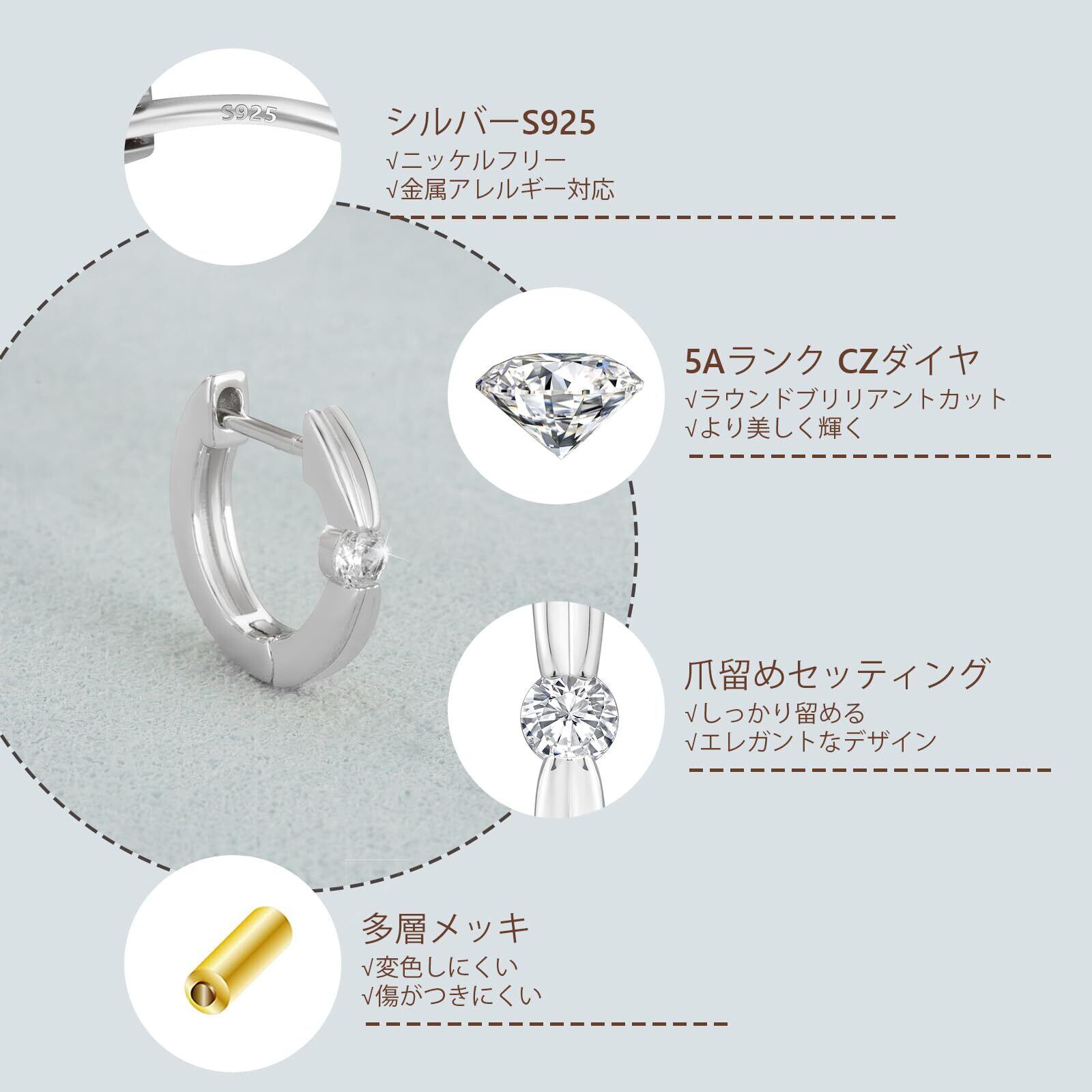 【本物ダイヤのように輝く】一粒CZダイヤが中央に丁寧に留められ、動くたびにキラキラと輝きを放ちます。5Aランクのジルコニアを使用したので、本物のダイヤモンドに近いリアルな輝きを持ちます。直径13mmの小さめサイズなので、使い勝手がよく、どんなコーディネートにも合わせやすいです。