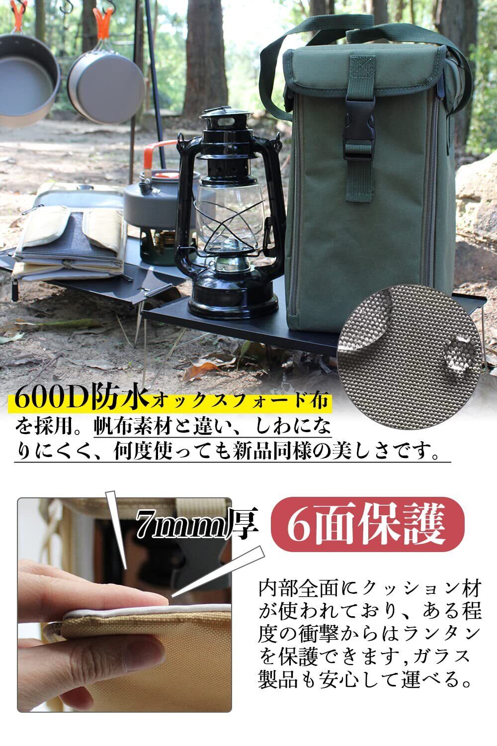 【全面保護】内部全面にクッション材が使われており、ある程度の衝撃からはランタンを保護できます,ガラス製品も安心して運べる。収納寸法を考慮し、緩衝材の厚みを7mmに設計しました、使用しないときは折りたたむことができ、折りたたみサイズは31×16.5×6cmです。ランタンケースの表面は、600D防水オックスフォード布を採用。帆布素材と違い、しわになりにくく、何度使っても新品同様の美しさです。