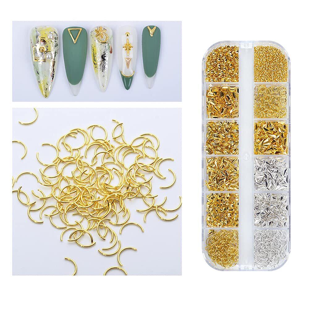 YFFSFDC ネイルパーツ 3本セット 金属パーツ ネイルデザイン アクセサリー デコパーツ 四角 三角 丸 パール フレークパーツ ネイルアート ネイルスタッズ ネイル デコレーション ゴールドネイルパーツセット (A)